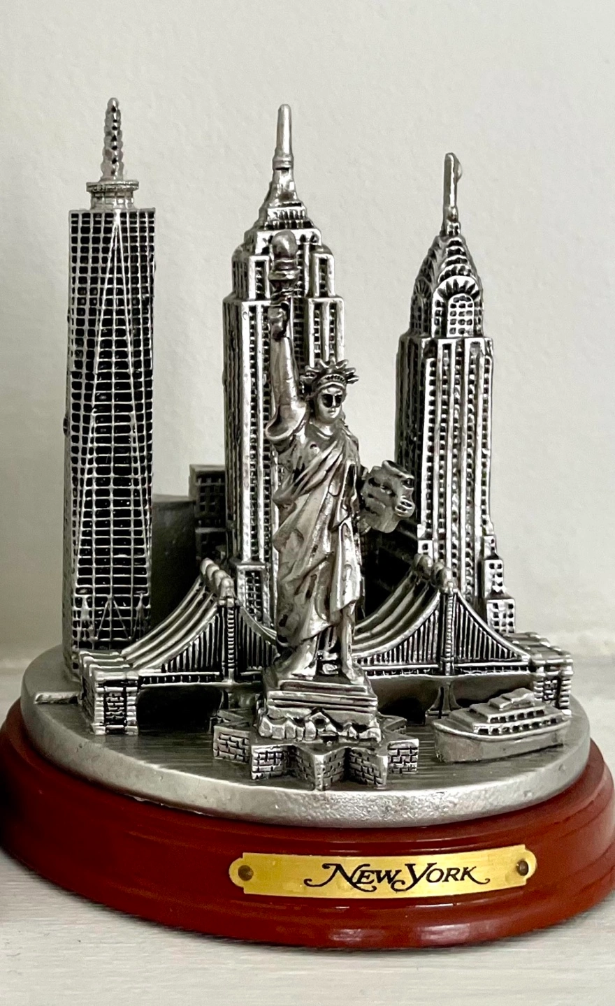 Collectible pewter figurine. Features iconic NYC landmarks: Statue of Liberty, Empire State Building, Brooklyn Bridge, and more. Comes in original box. Great souvenir or gift.