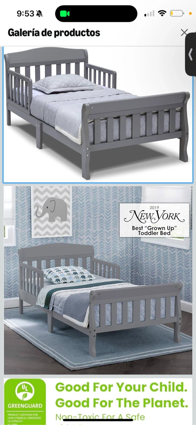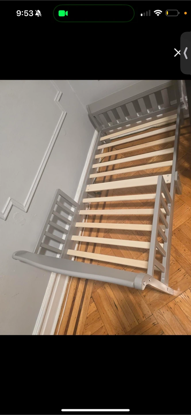 Selling a New York "Grown Up" Toddler Bed in gray! It's in great condition and ready for a new home. This bed is perfect for transitioning your little one from a crib to a bigger bed. It's sturdy and safe, designed with your child's comfort in mind
