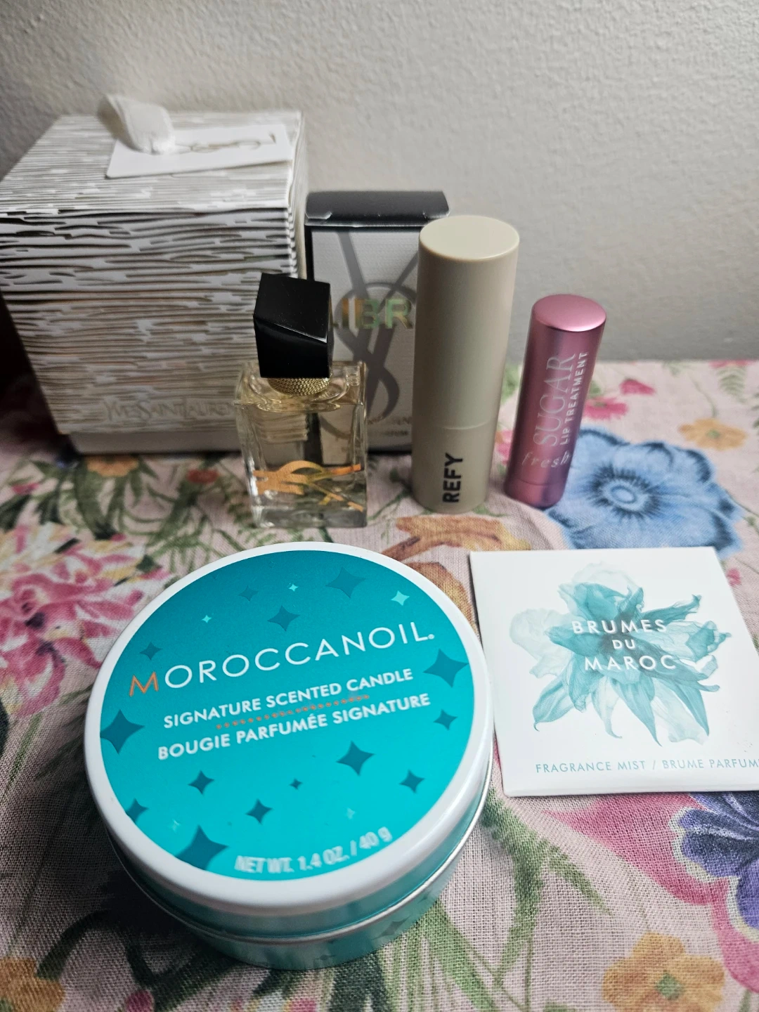417all for $20 -Brand NEW YSL Libre 7.5ml Perfume - NEW Morrocanoil Candle & Perfume -Refy & Fresh Sugar like NEW Refy Bloom lipstick used twice, I bought in the first week of October @Sephora this is not my colour