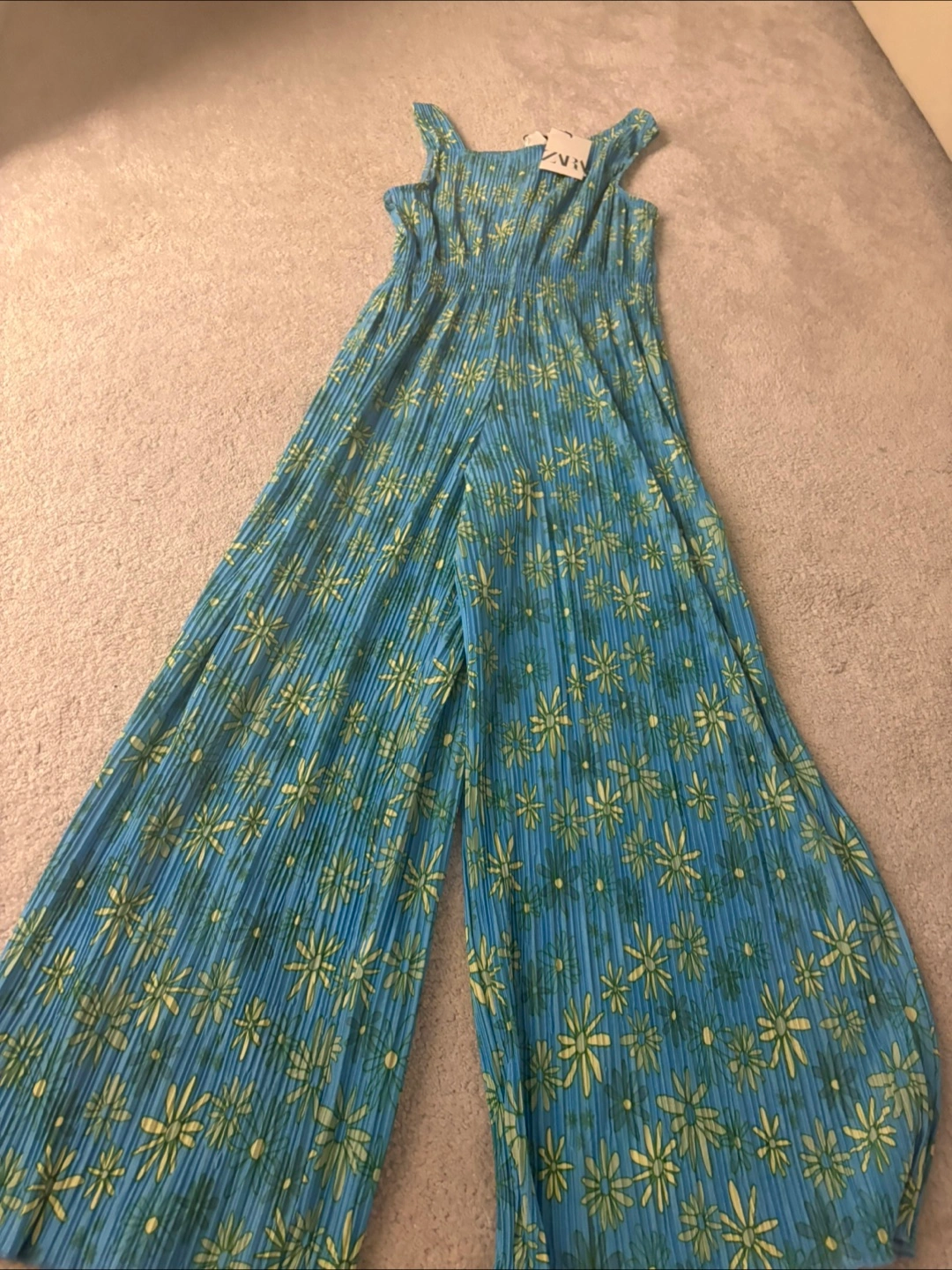 Selling a new Zara jumpsuit. It's a beautiful blue colour with a floral pattern and a pleated texture. The size is extra small.