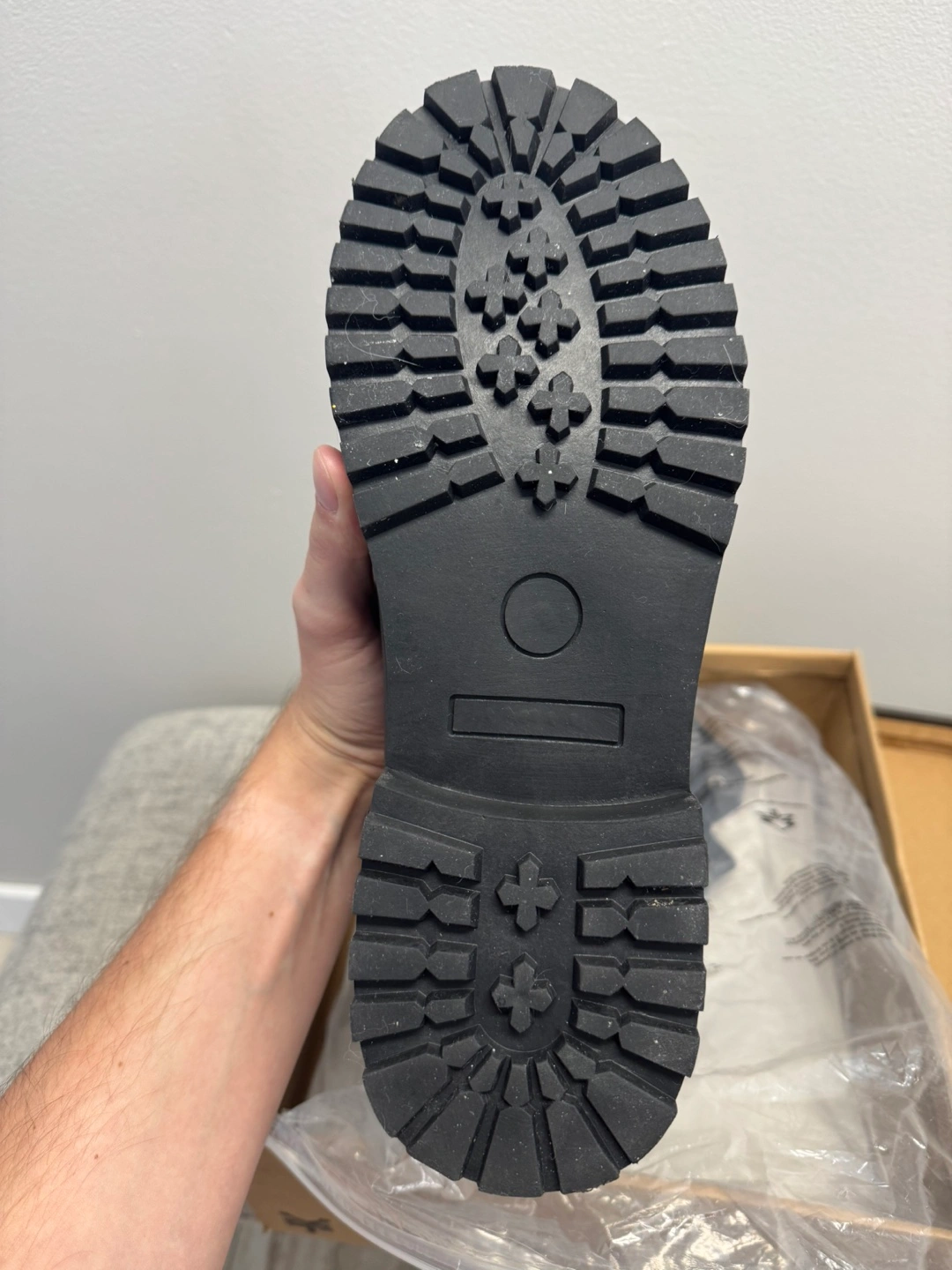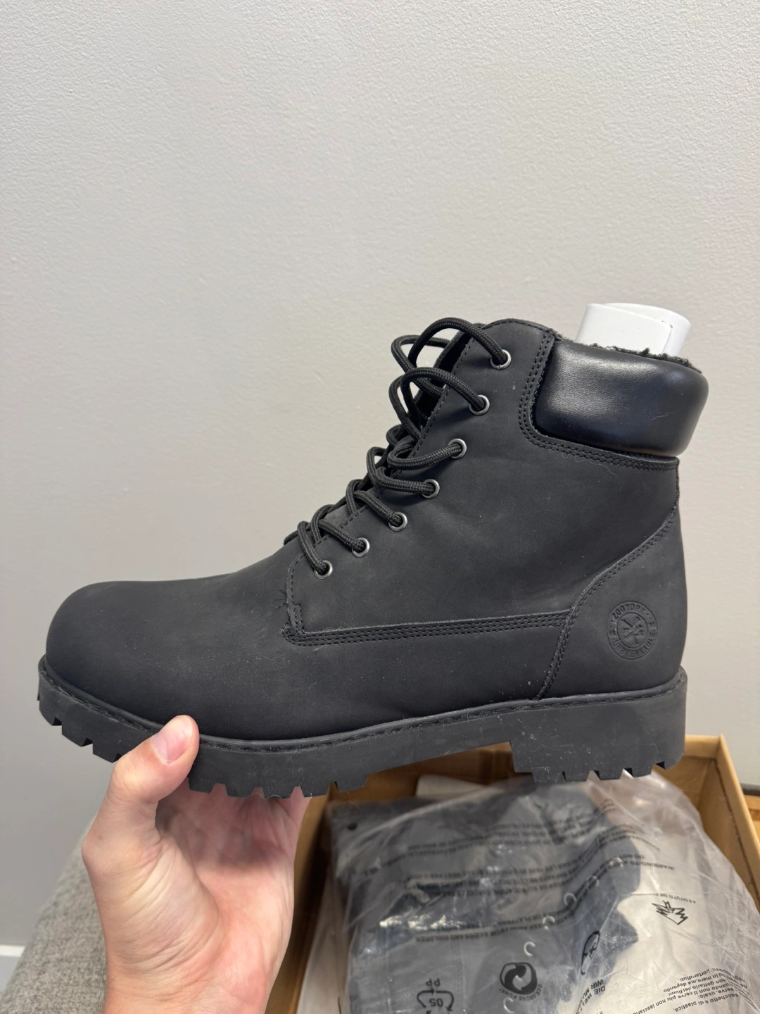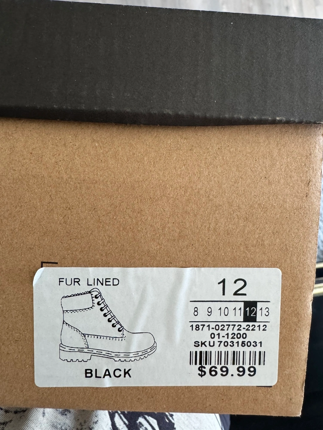 63Brand new, never worn men's size 12 black boots. Fur-lined interior. Lace-up style. Boxed.
