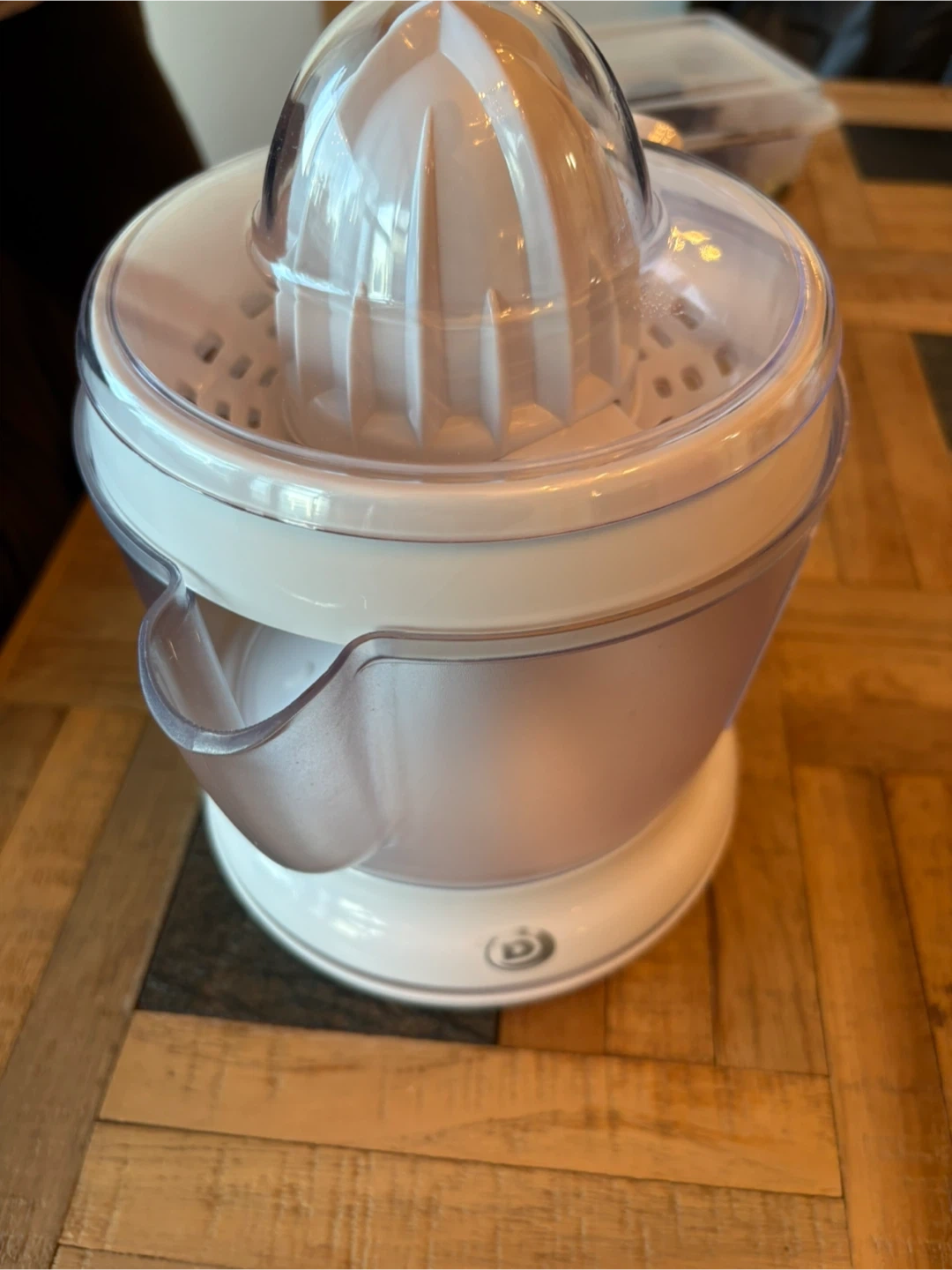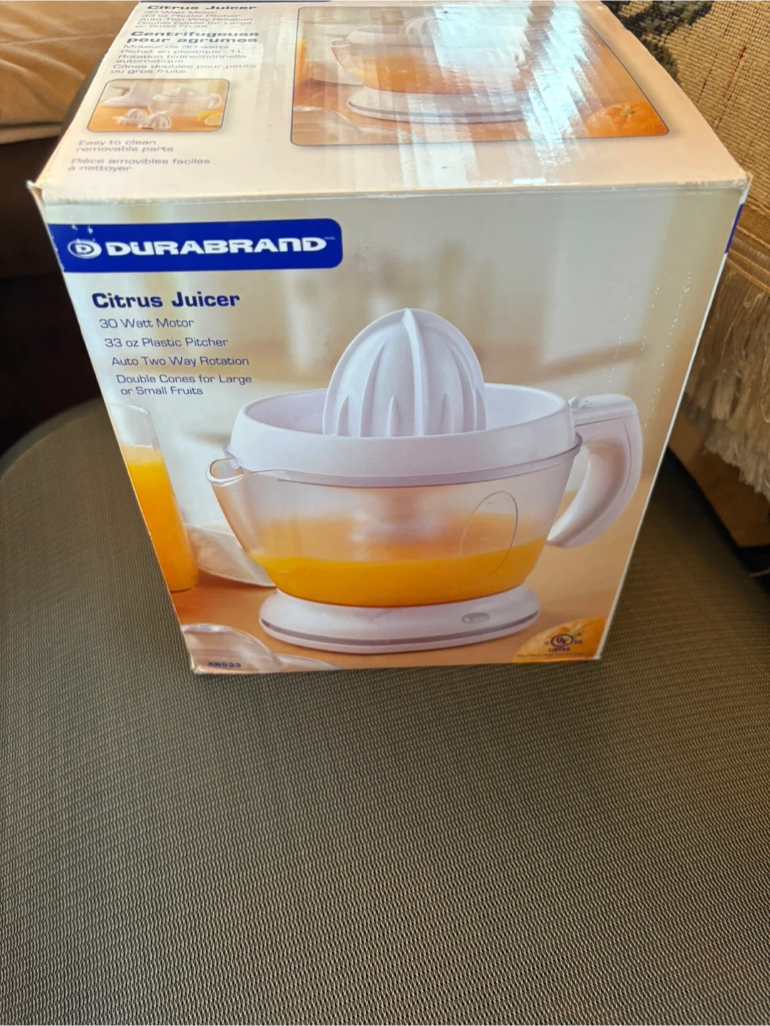 180Selling a DuraBrand citrus juicer. It features a 30-watt motor and a 35 oz plastic pitcher. It also has an auto-two-way rotation and double cones for large or small fruits, making juicing easy and convenient