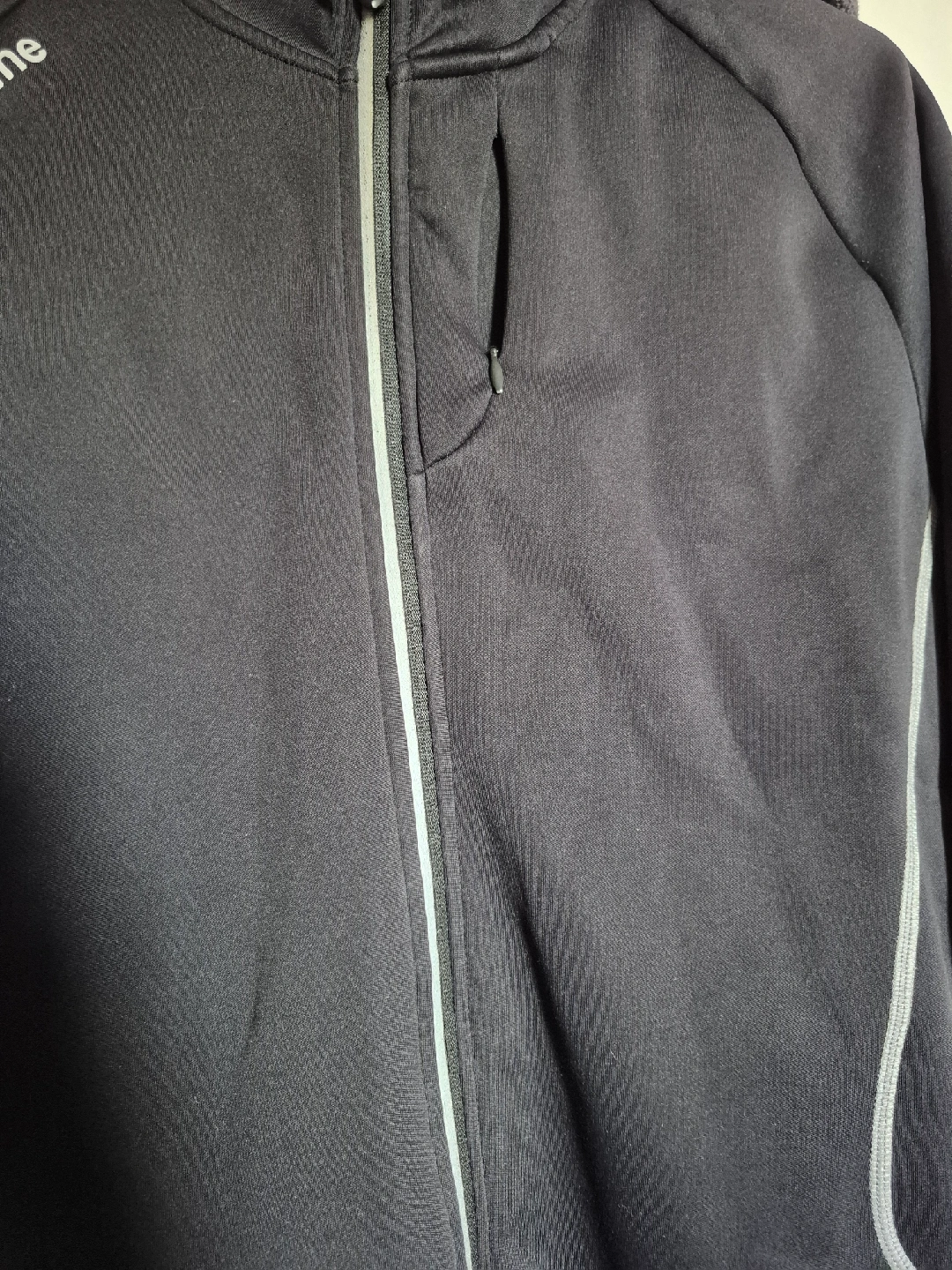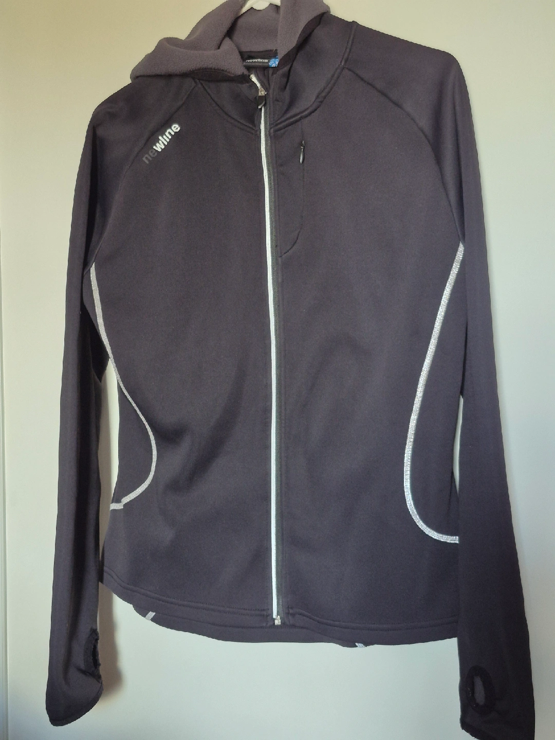 18Here's a black active zip-up hoodie from Newline. It's in great shape and ready for your workouts or casual wear. The hoodie features a full zip, a hood, and thumb holes for added comfort and functionality. It also has a hidden pocket.