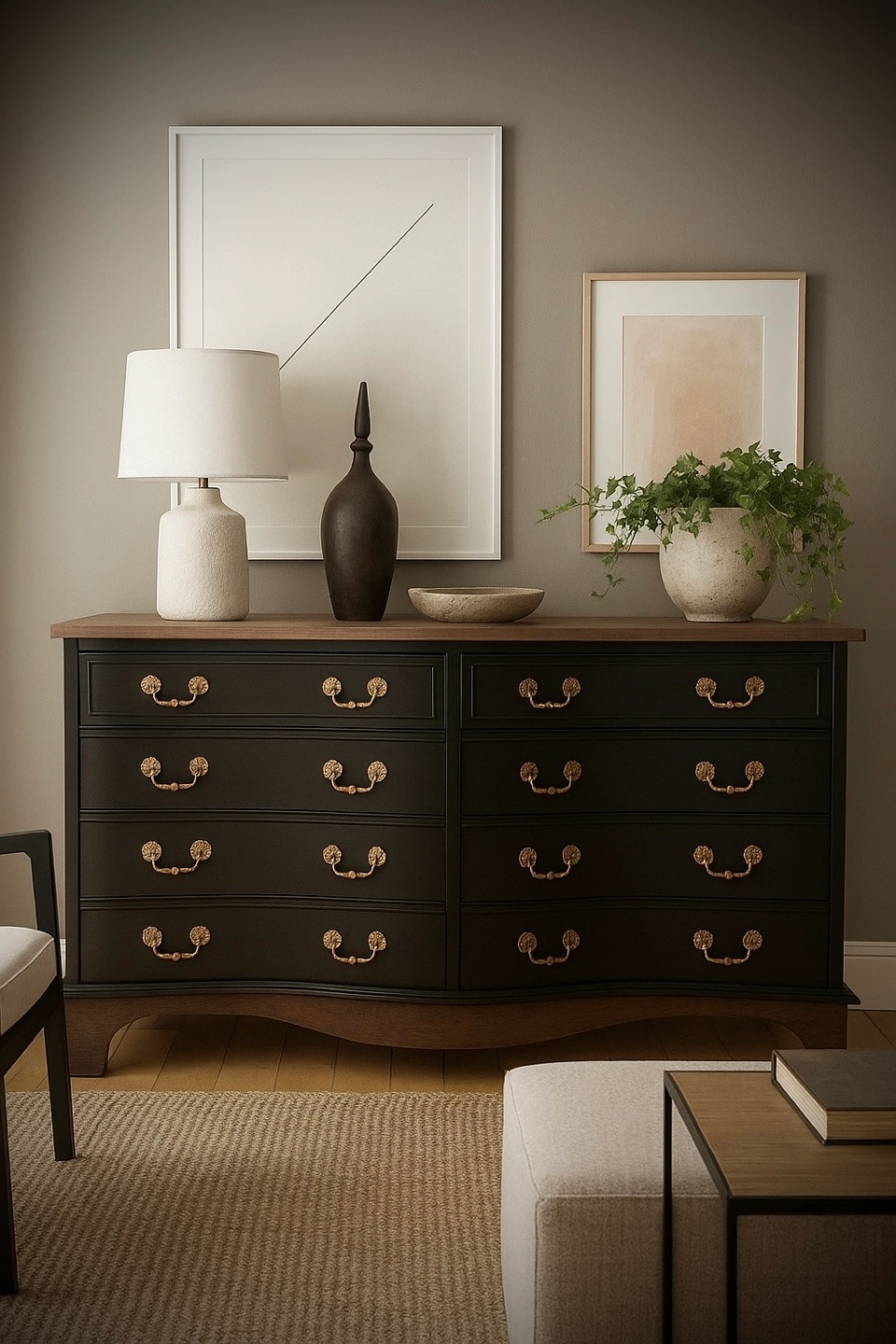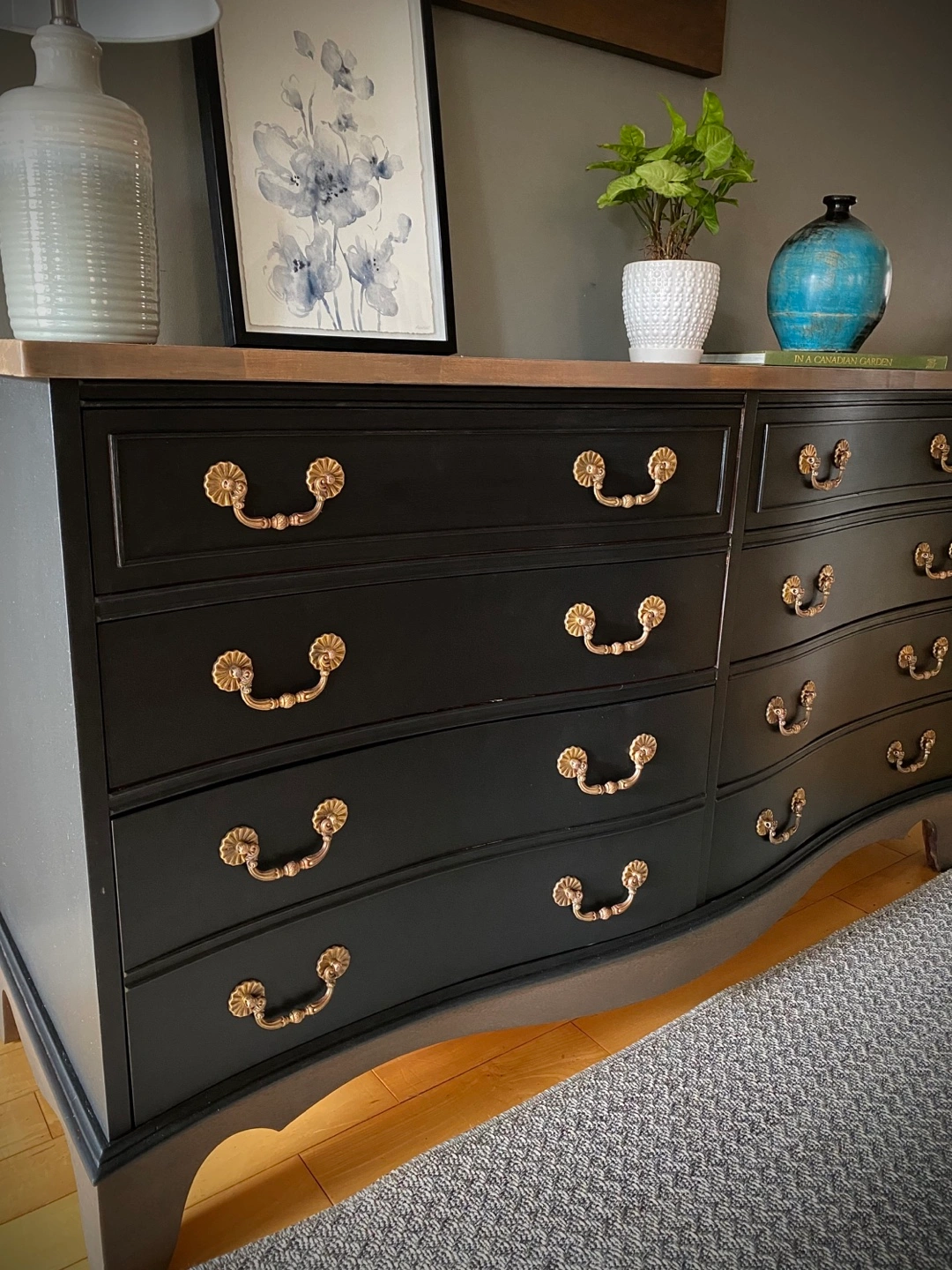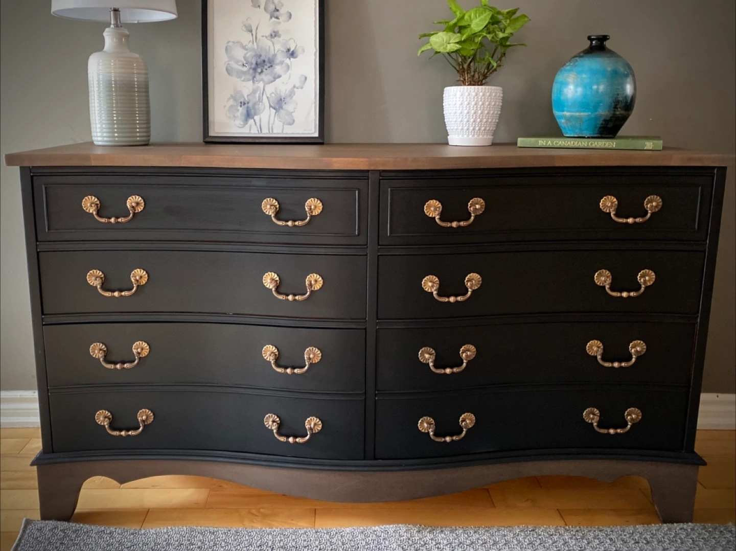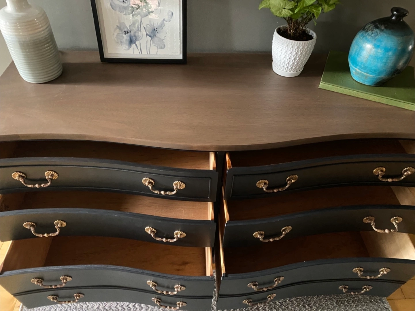 37This stunning solid mahogany serpentine-front Knetchel Canadian made dresser has been professionally refinished and restored to a modern, high-end look while keeping all its original charm. ✔ Refinished Details • Body: Fusion Coal Black – smooth, durable, and ultra-modern • Top & Base: Fully sanded, paint-washed to neutralize the red mahogany tones, then stained in Cappuccino SFO • Hardware: Original vintage Knetchel pulls – cleaned, polished, and preserved • Wood Conditioning: Treated with Howard’s Feed & Wax for a rich, nourished finish • Topcoat: Protected with General Finishes for durability ✔ Storage • 6 drawers total • Lower two drawers on each side are double-depth, offering excellent hidden storage ✔ Measurements • Width: 56” • Depth: 20” • Height: 32” ✔ Versatile Use Perfect as a dresser, sideboard, entryway piece, or living room credenza. The serpentine front, solid mahogany construction, and freshly updated finish make it a standout luxury piece for any home. 📦 Holds available with a 30% deposit