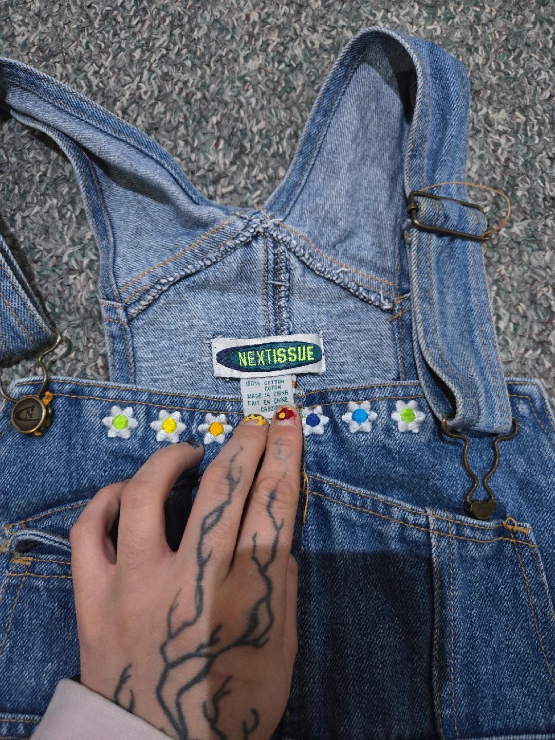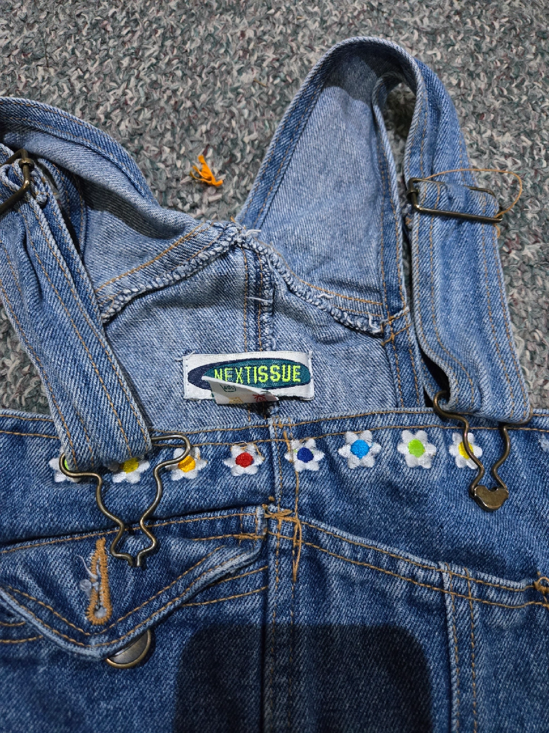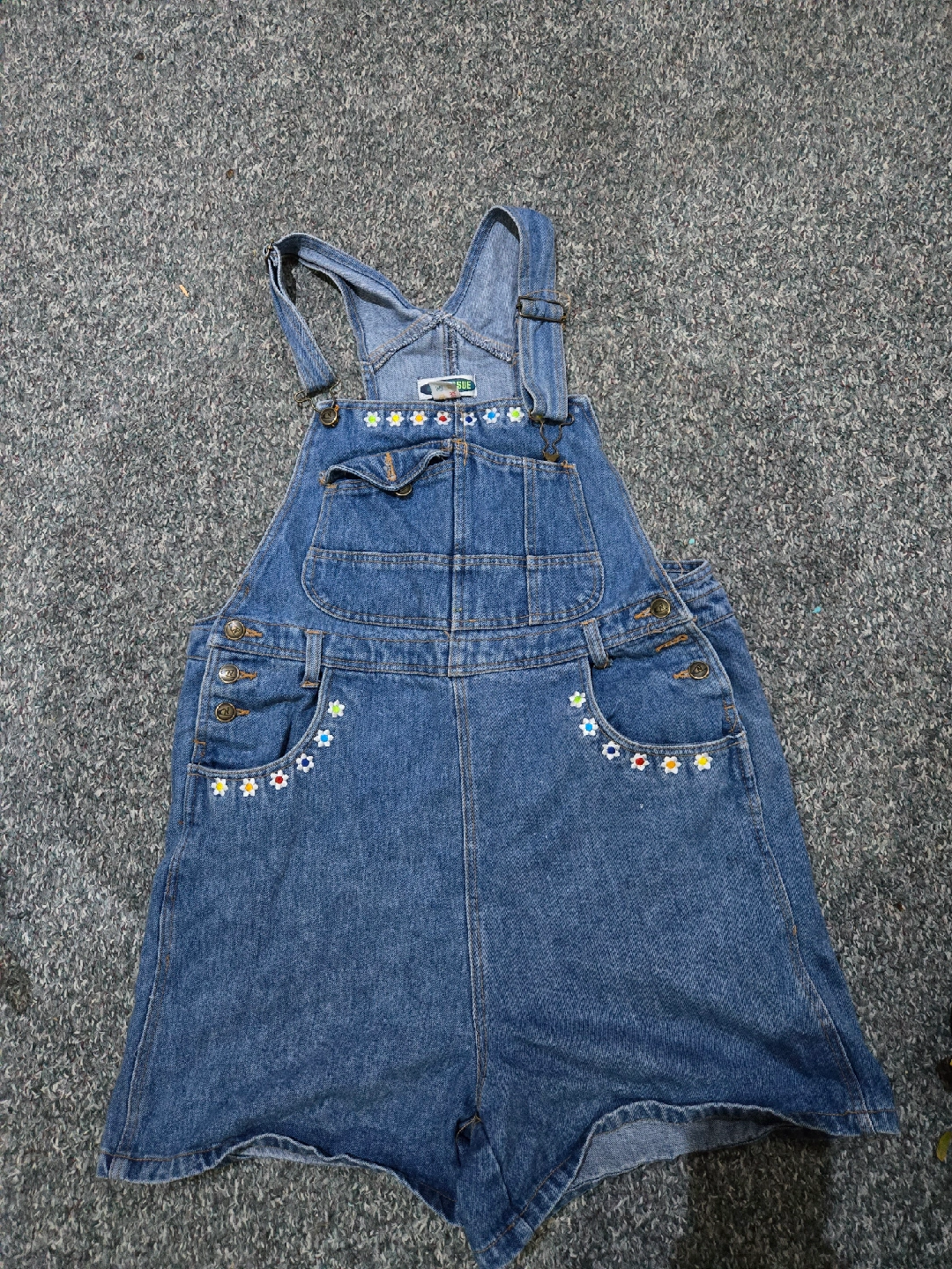 Cute denim overalls shorts from Next Issue! They feature adorable flower embroidery. Definitely a DIY item as the straps need to be repaired. Size M/L womens.