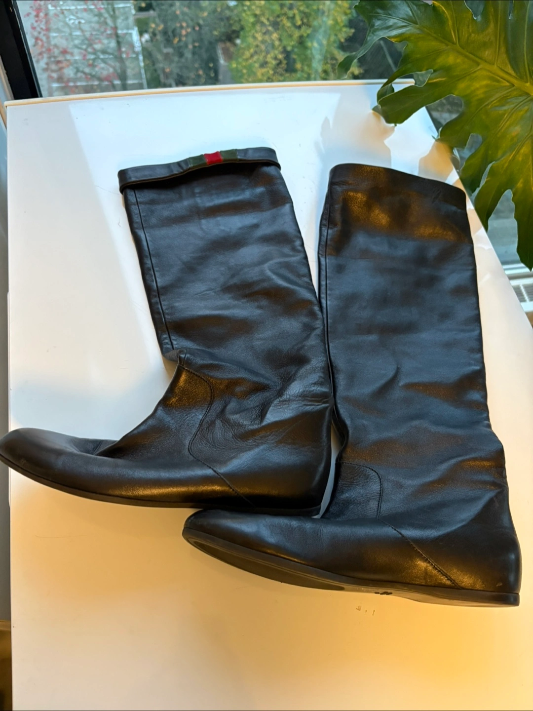 Selling a pair of Gucci black leather boots in size 36.5 They're in good condition and would be a great addition to your wardrobe original willing to part with them. Let me know if interested and will send a vid hard to take photo of such soft kid leather in immaculate condition .