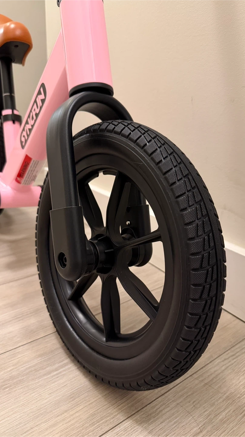 This is a pink SYNCFUN balance bike. It has a comfortable brown seat and textured grips. The bike has durable black wheels.