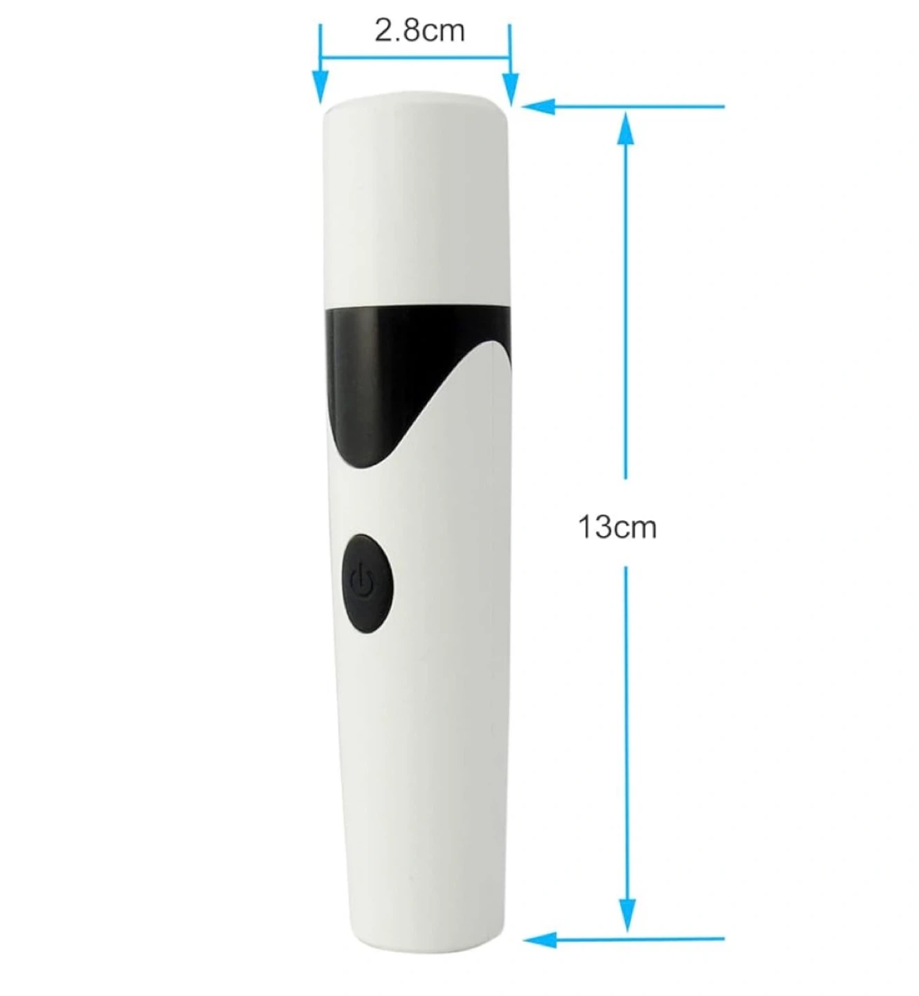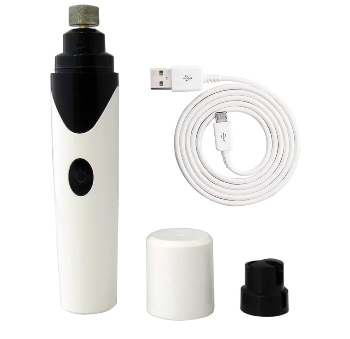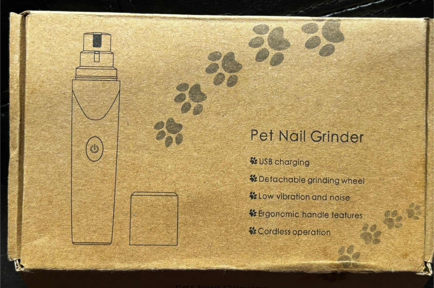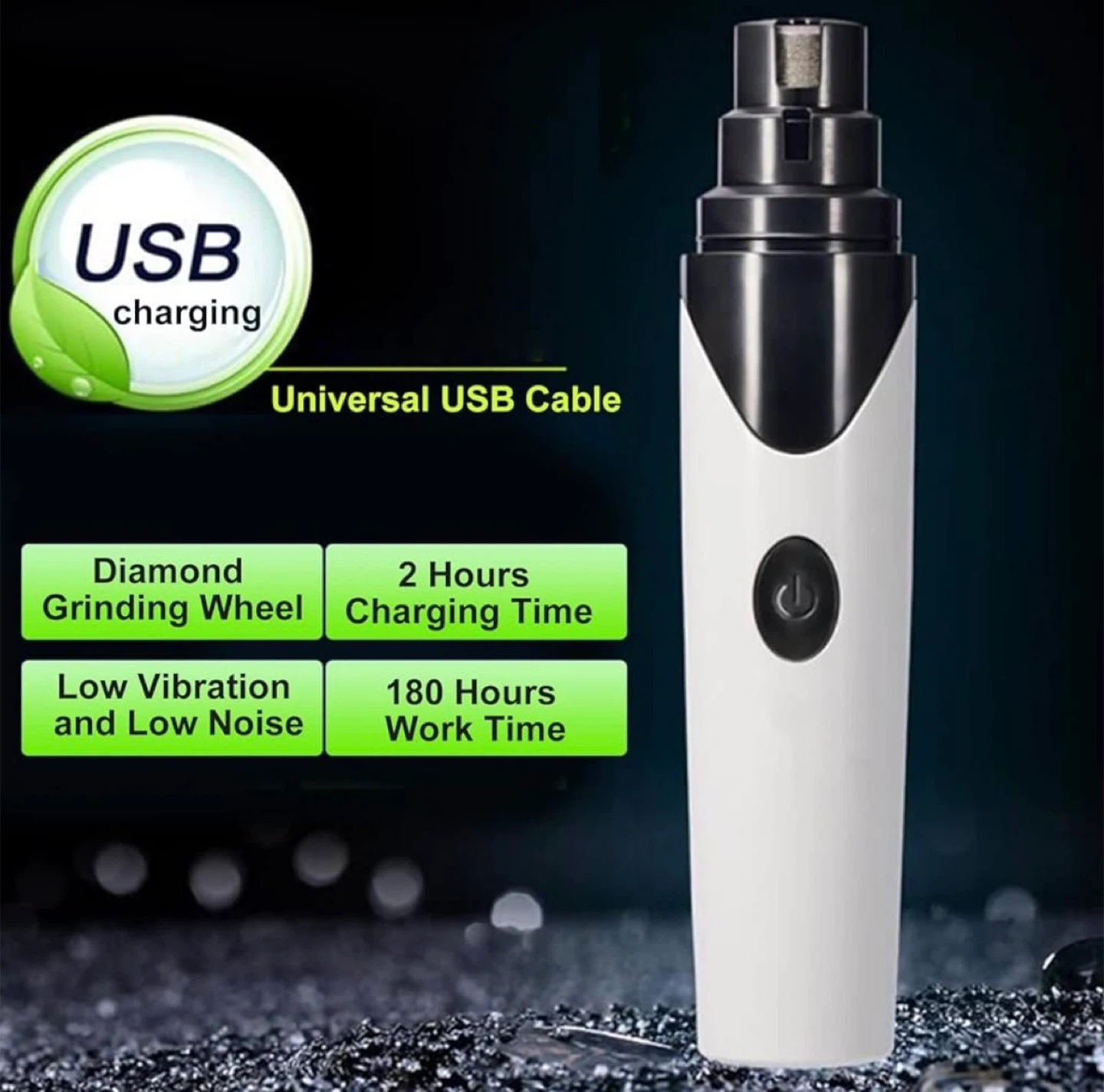 Pet nail grinder with USB charging and detachable grinding wheel. It's designed for low vibration and noise with ergonomic handle features and cordless operation. Includes user manual and USB cable.
