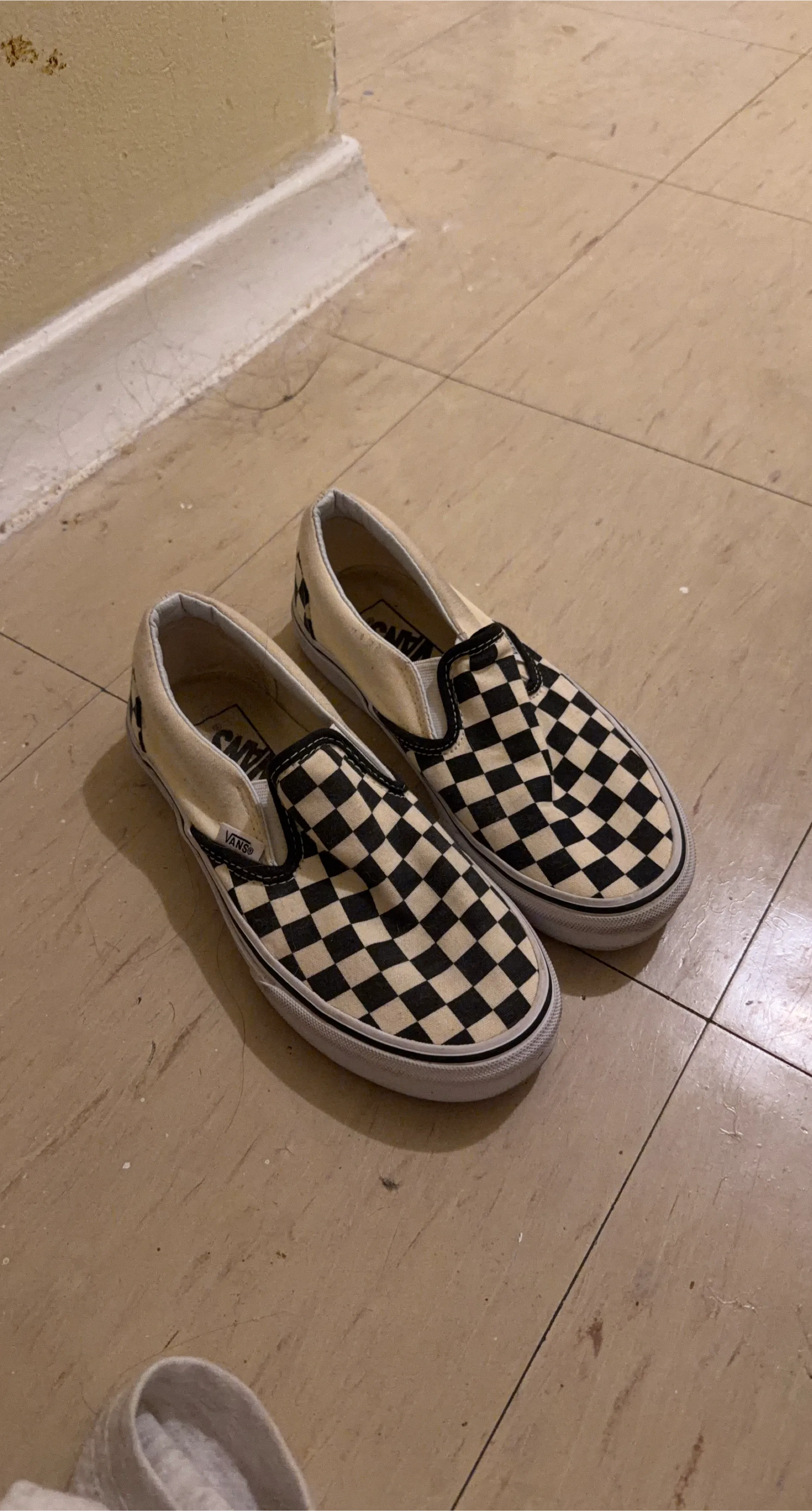Classic Vans slip-on shoes with checkerboard pattern. Canvas upper and rubber sole. Simple to slide on for everyday wear.