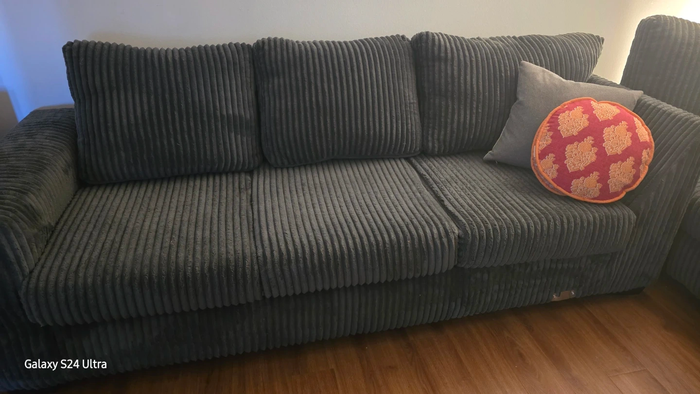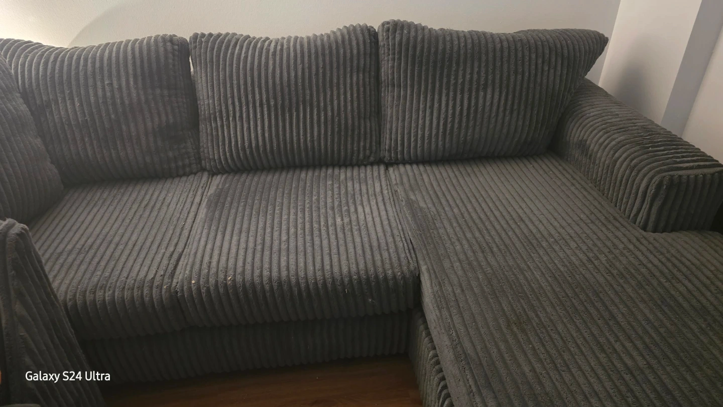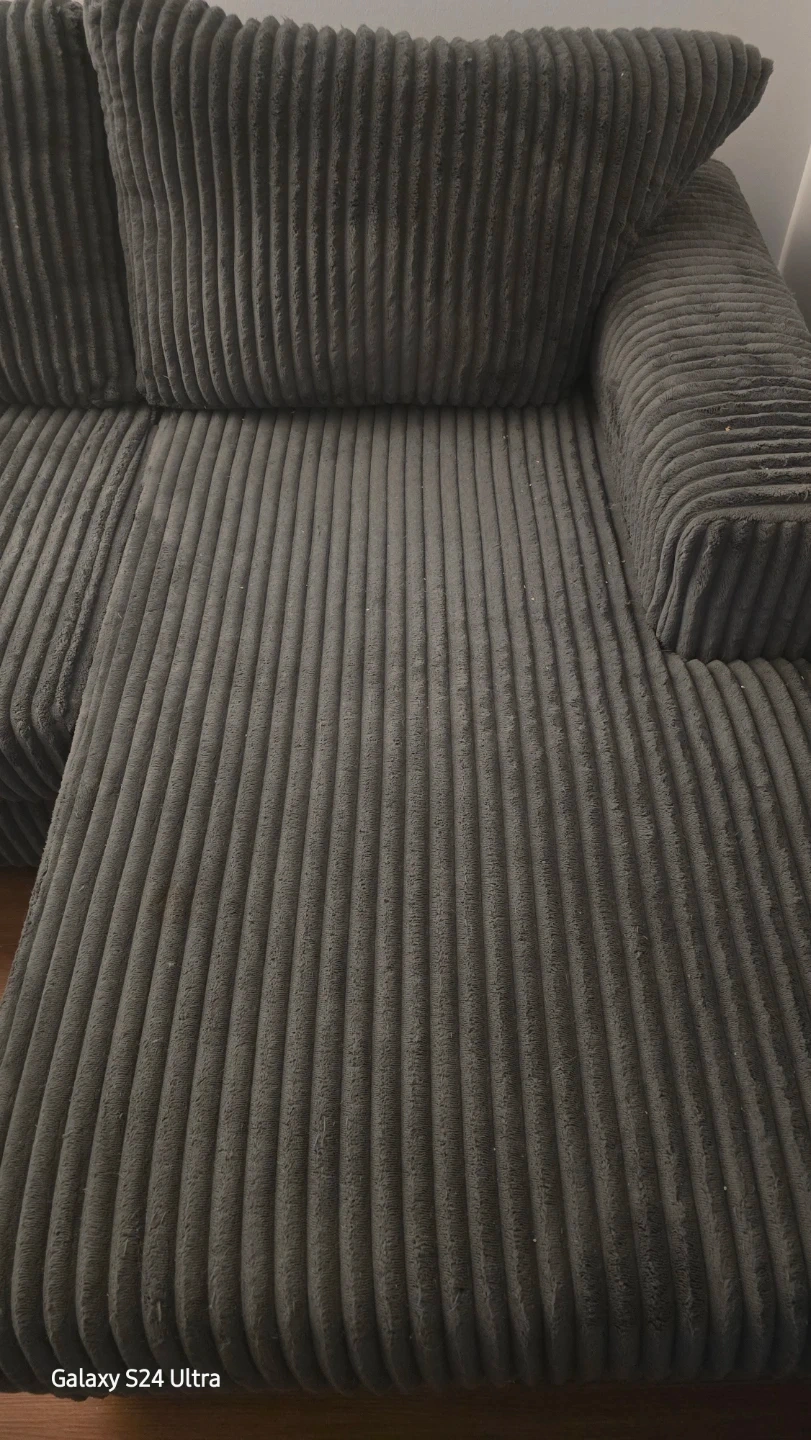Comfy grey corduroy sectional sofa. It's soft and has deep seating. Perfect for a living room or rec room!