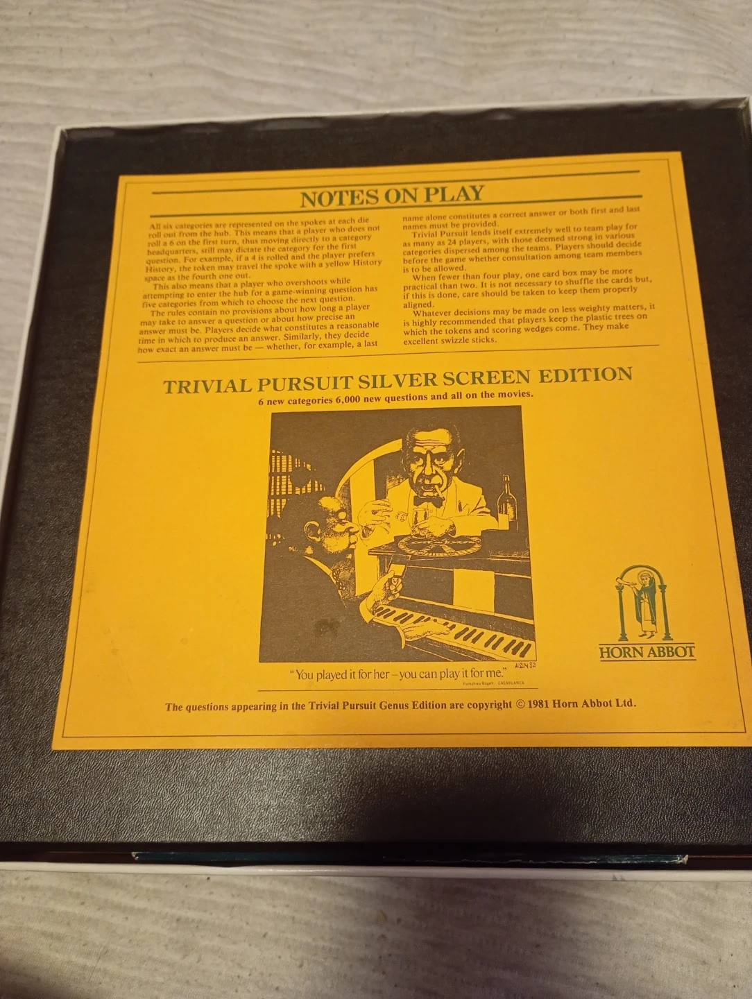 This Trivial Pursuit Master Game features the Genius Edition with 6 new categories and 6,000 questions, all concerning movies. The game was copyrighted in 1981 by Horn Abbot Ltd. It's a fun way to test your knowledge!