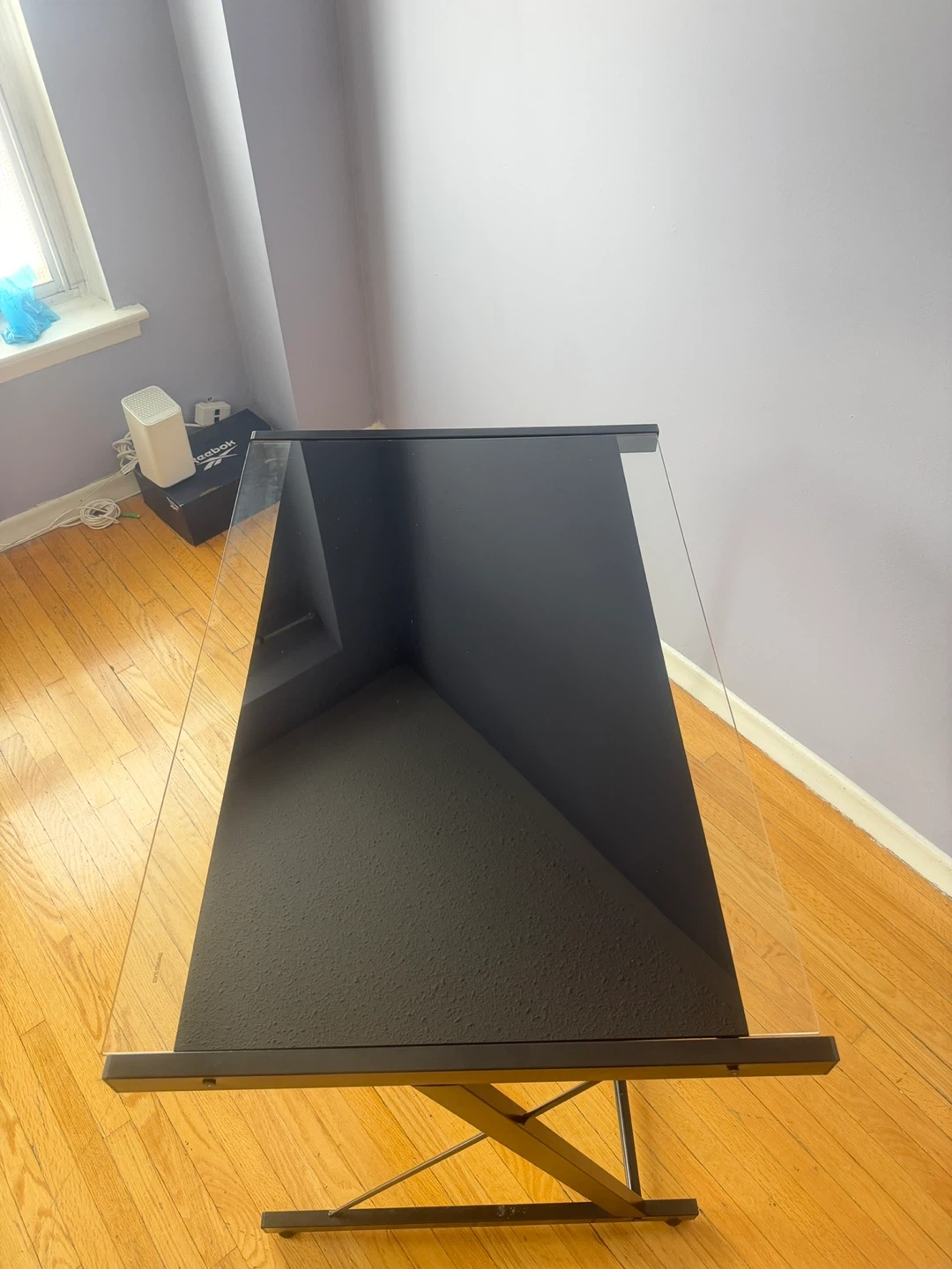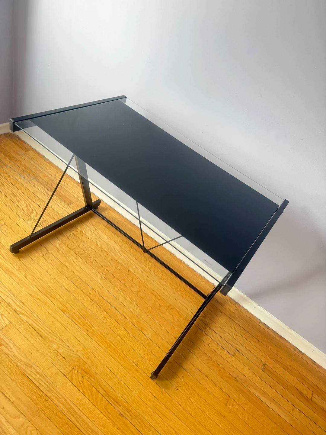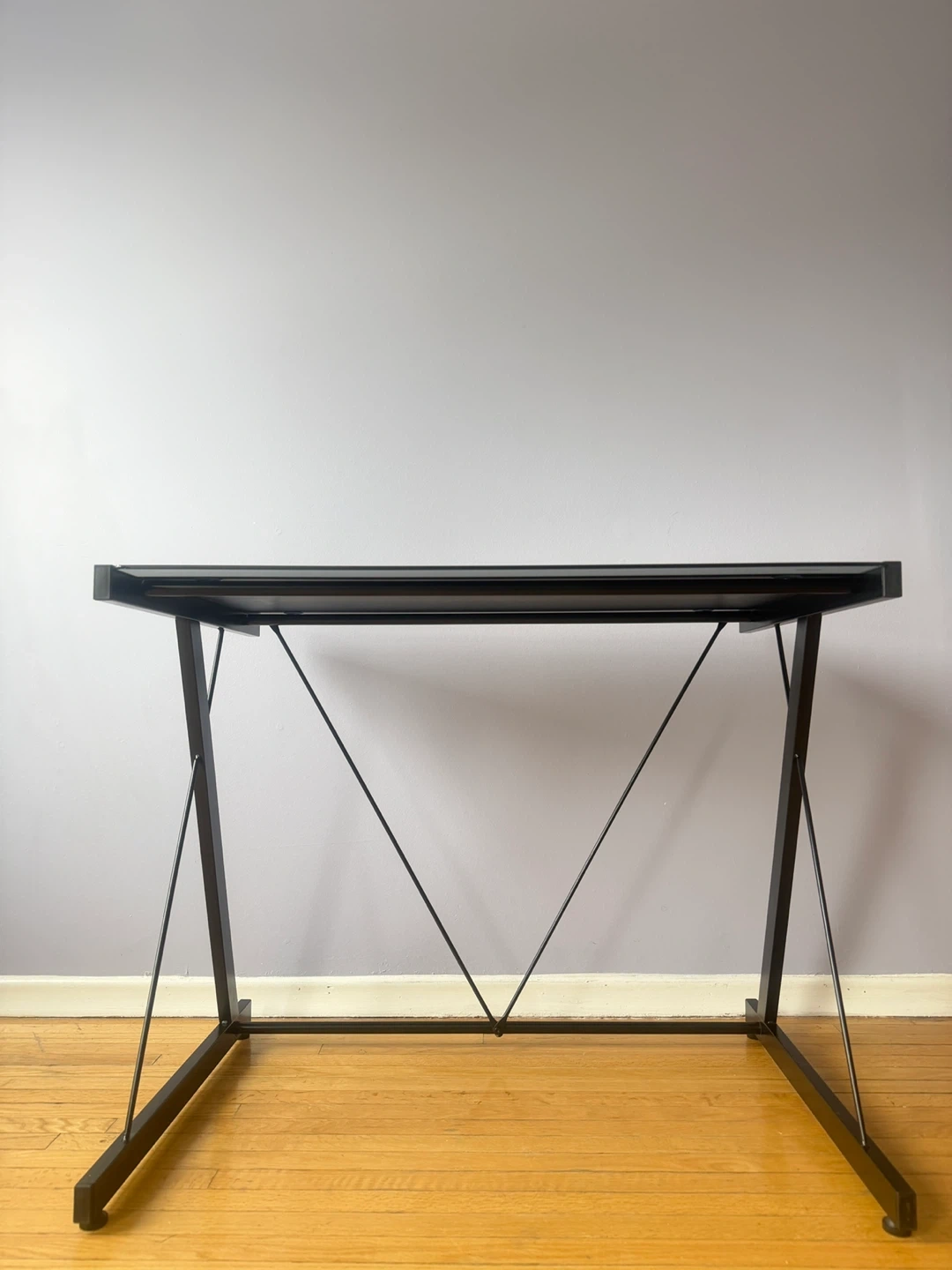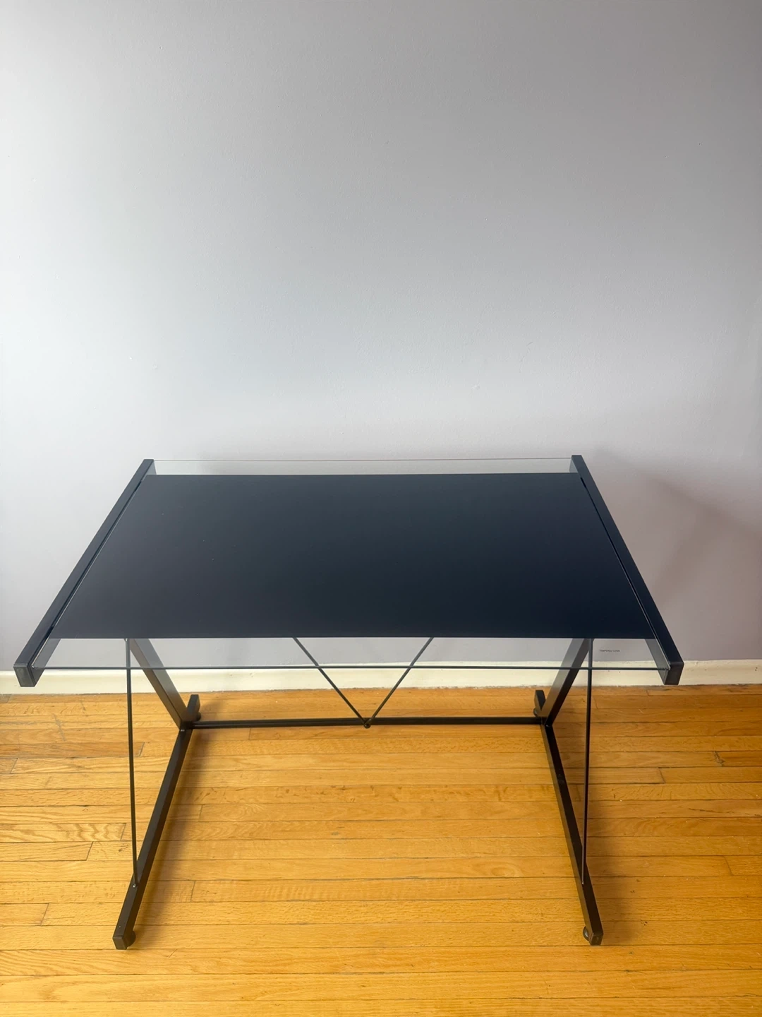 A sleek desk featuring a black glass top and a sturdy metal frame. It's perfect for a home office or study space. The X-shaped legs provide stability.