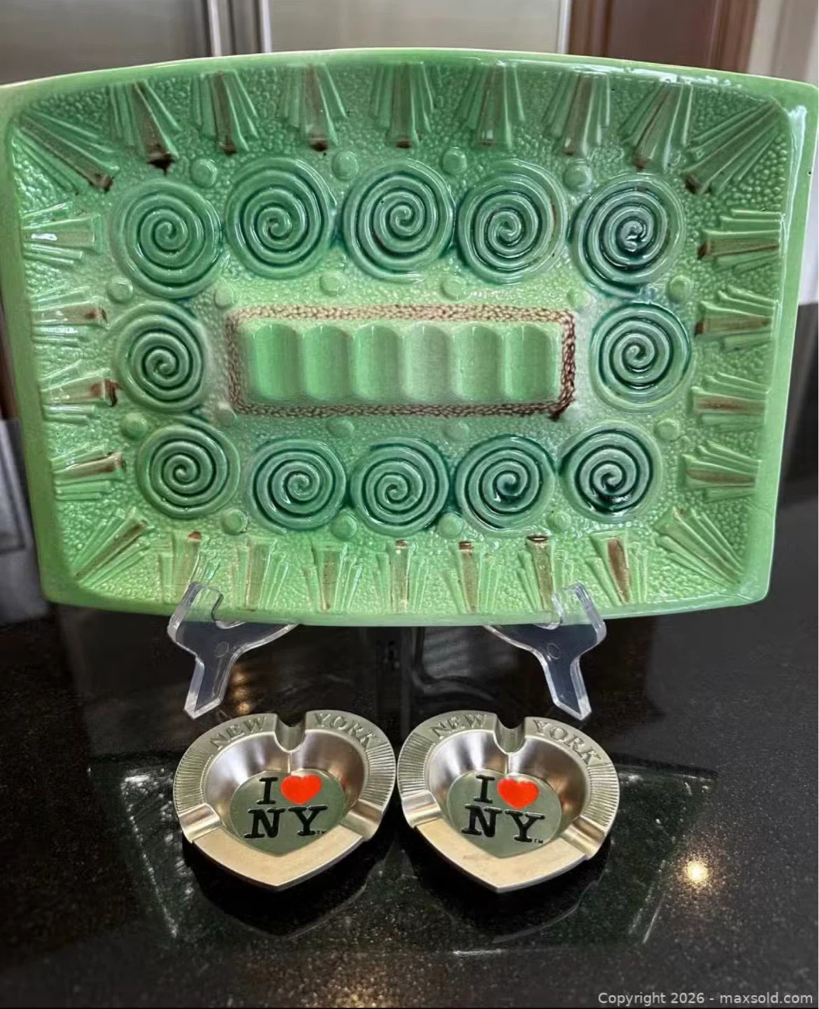 A vibrant green ceramic ashtray features a unique textured design. It includes two small, heart-shaped metal ashtrays with "I Love NY" graphics. This set's retro style makes it a neat decorative piece.