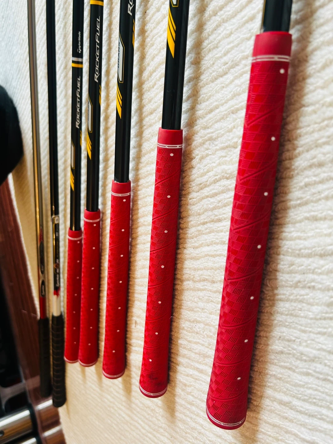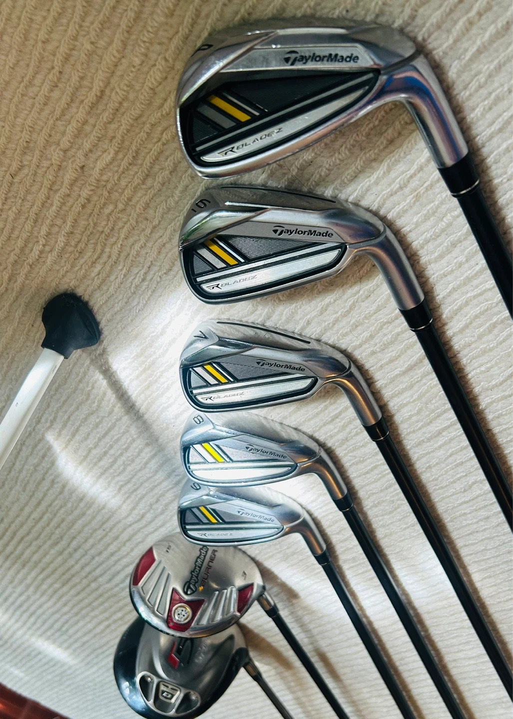 Irons 6,7,8,9/Pitching Wedge: TaylorMade RBladeZ, Graphite Shaft, Rocketfuel 65g, R-Flex.