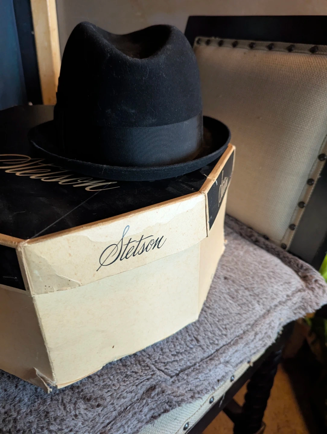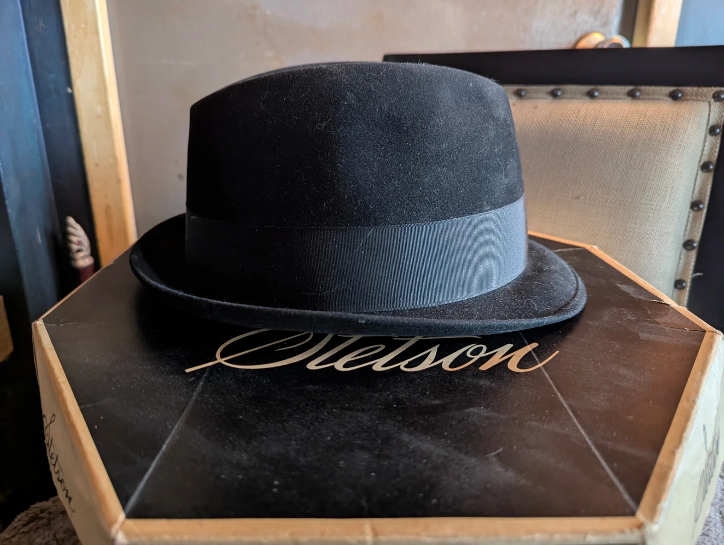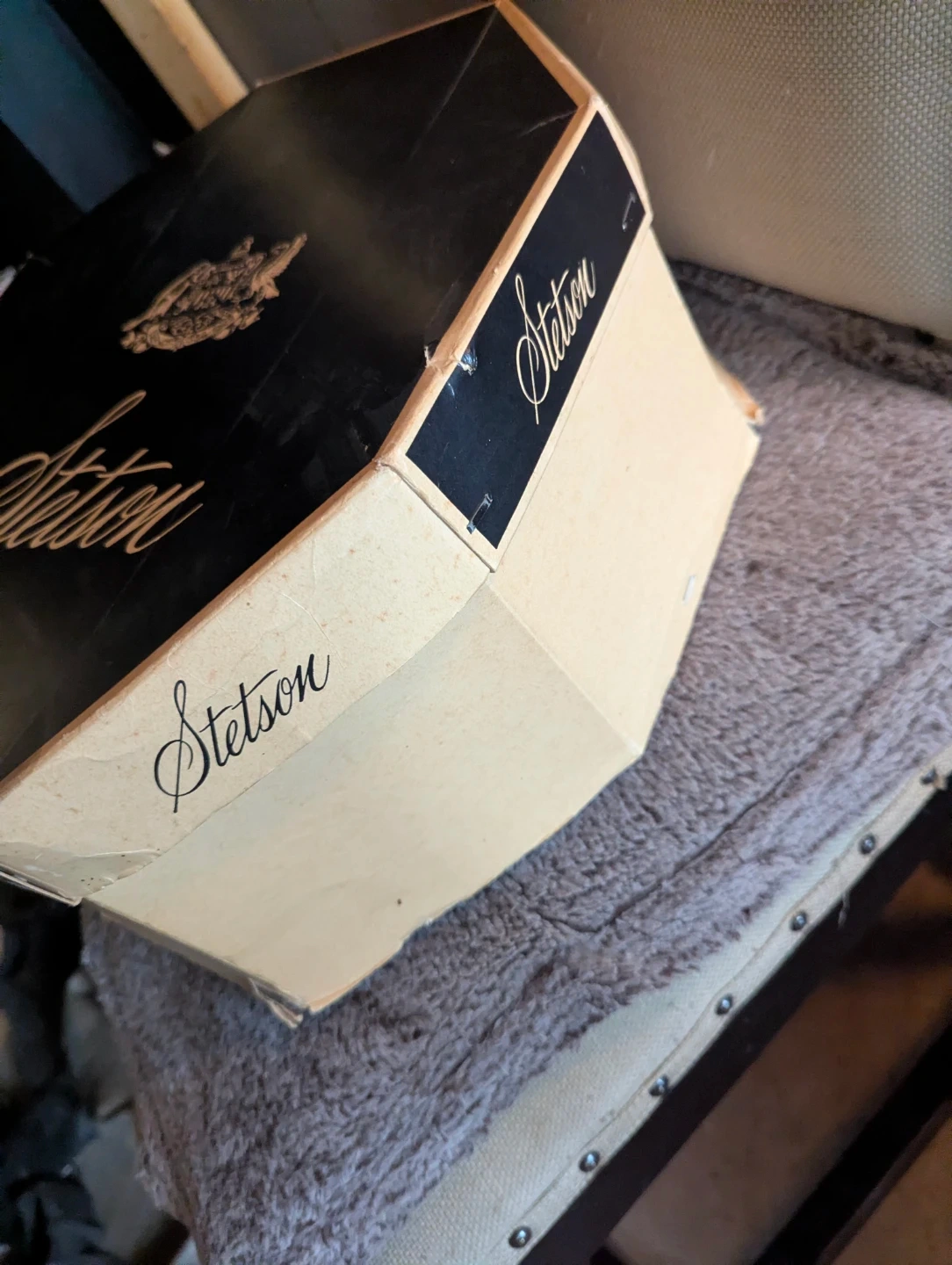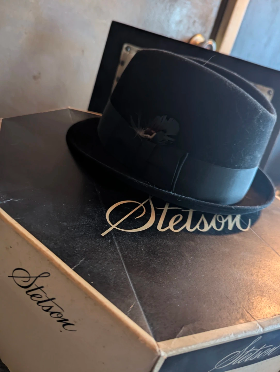 Adding a touch of panache, this hat has stories to tell, and like a good book, it’s ready for its next chapter. If the ad is up, the hat is available, ready to top off your look! Comes in a stetson box.