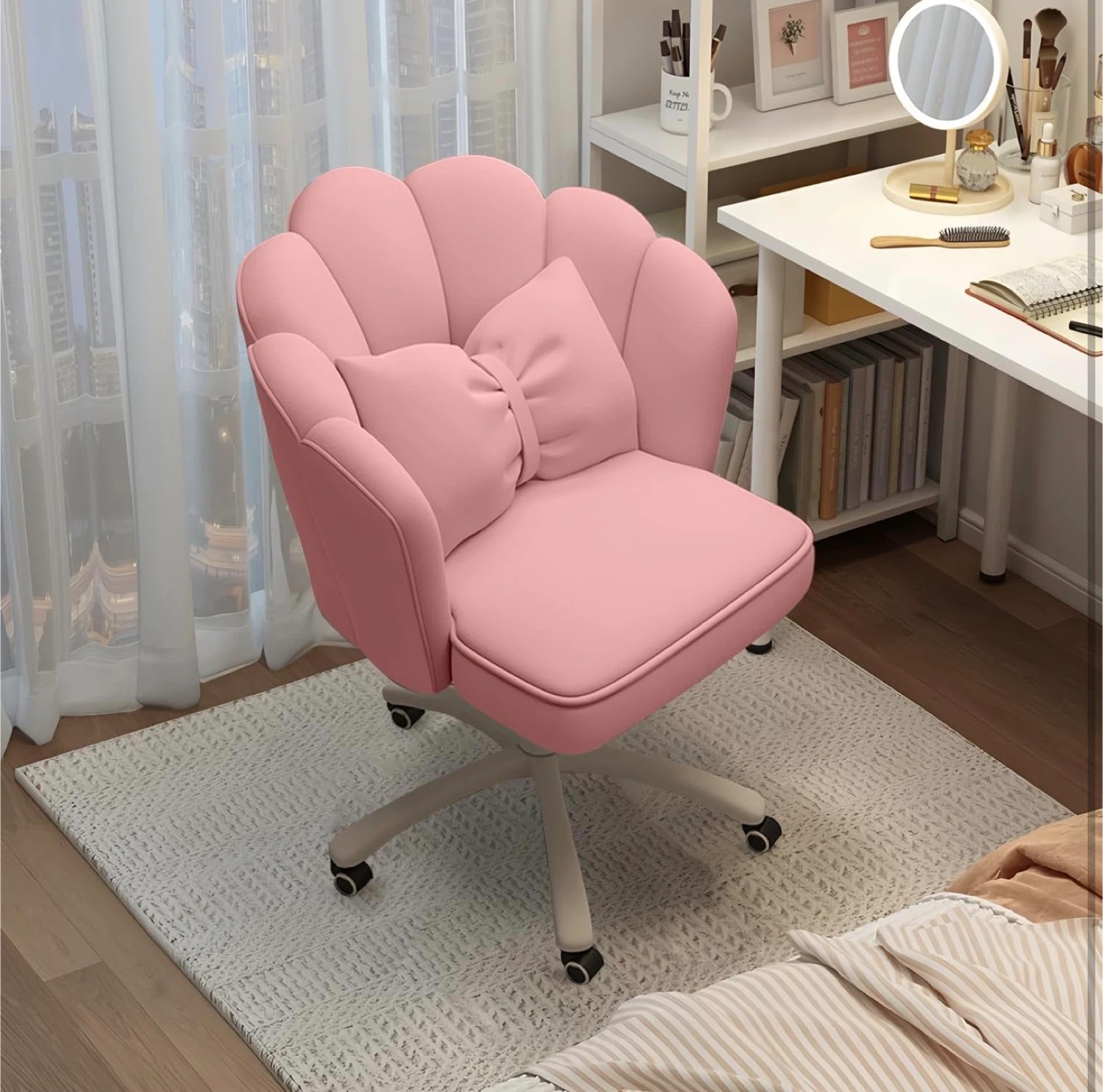 This cute pink velvet office chair features a unique shell design and comes with a decorative bow pillow. It has a sturdy base with rollers for easy mobility. Sitting height is 17.7 inches, and the overall height is 30.7 inches.