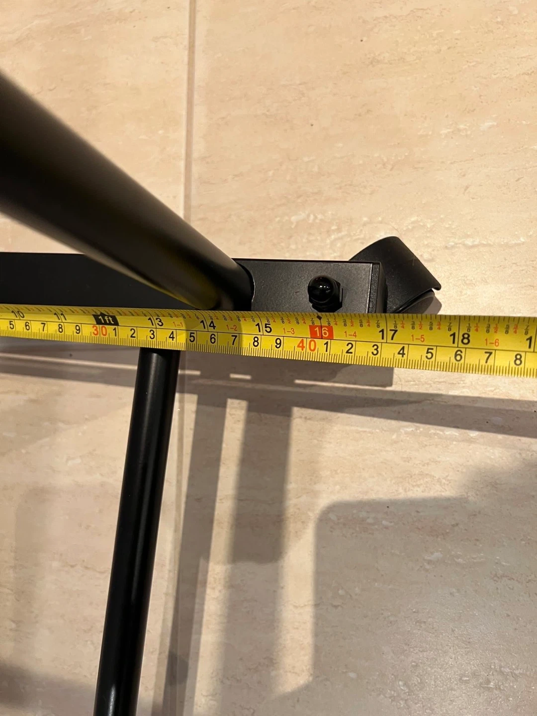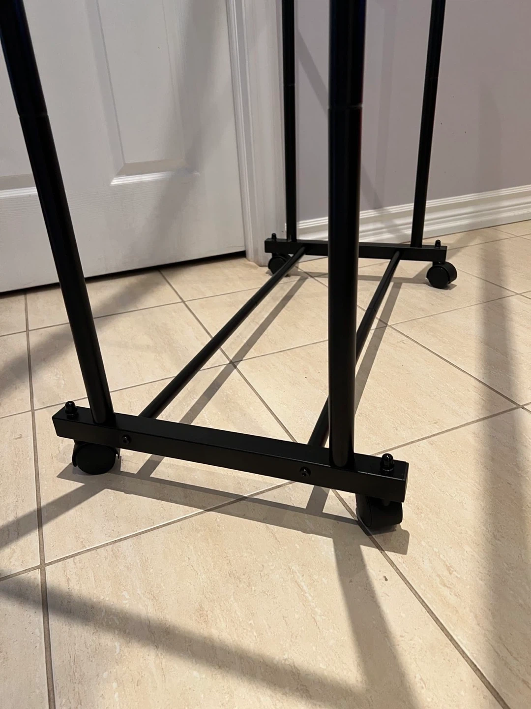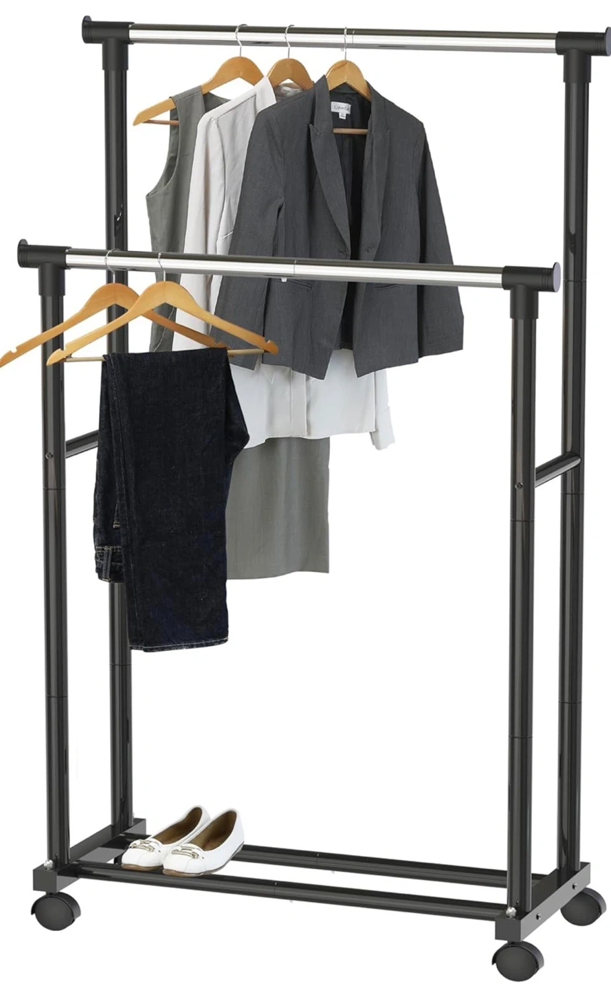 This is a black double garment rack. It has two hanging rails for clothes. The rack is on wheels for easy movement. It's approximately 63 inches tall. It provides lots of hanging space!