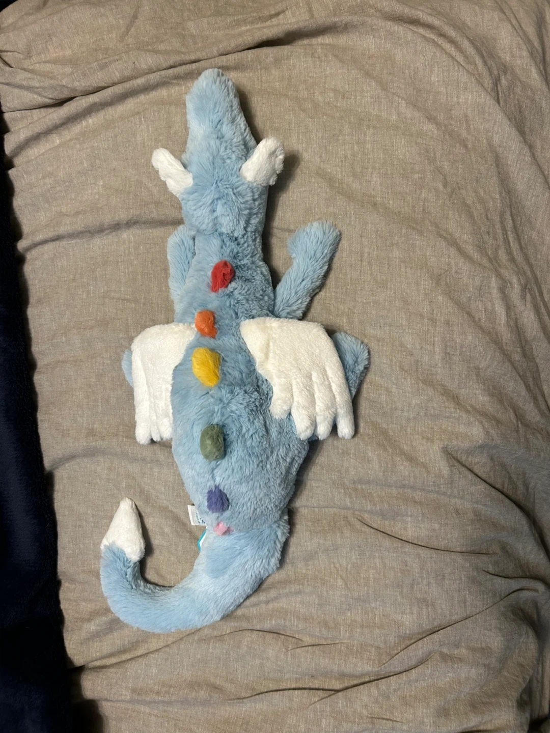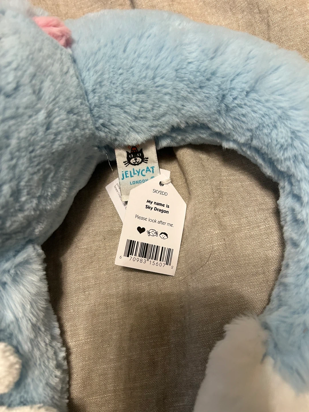 This is a Jellycat Sky Dragon plush toy. It's light blue with colourful accents and white wings. It's super soft and cuddly! Brand new