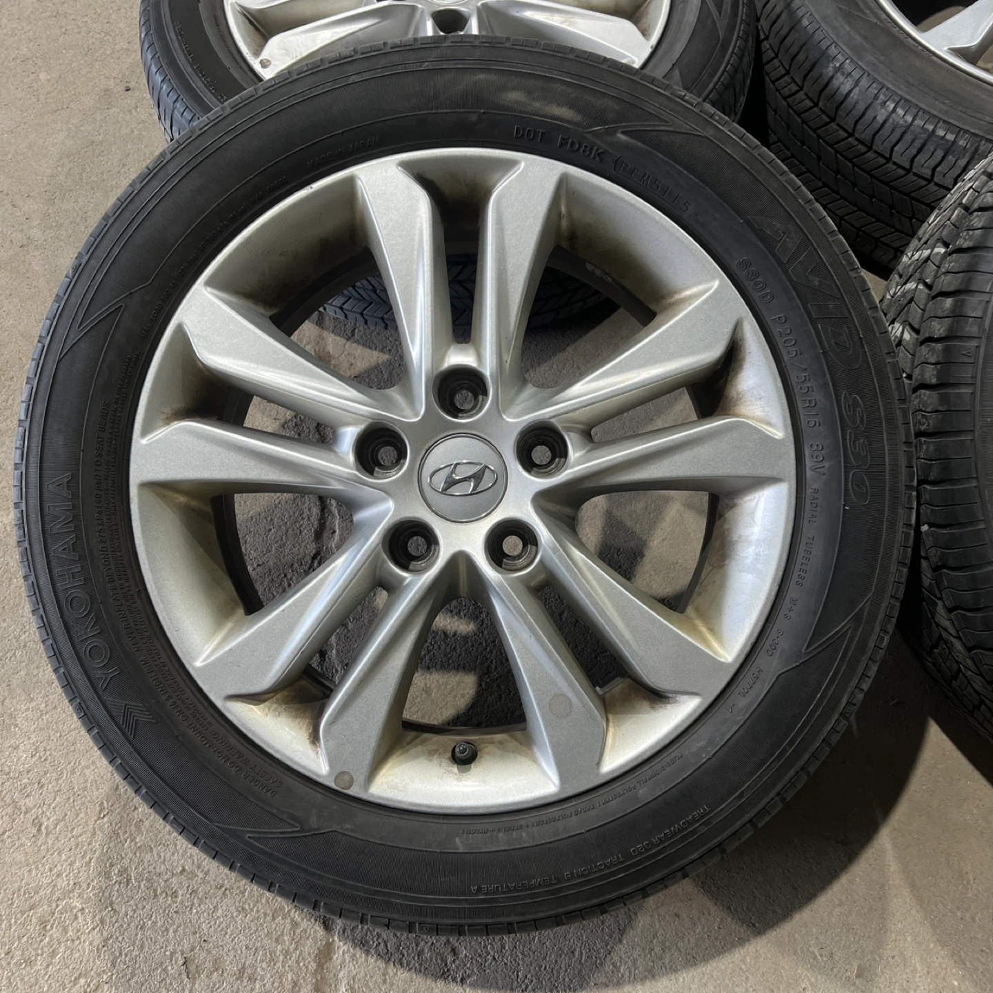 Set of four OEM Hyundai Elantra aluminum alloy rims 5x114.3 67.1 with Yokohama all season tires on it. Tires have about 50% tread left on them. Only good for about 1 season
