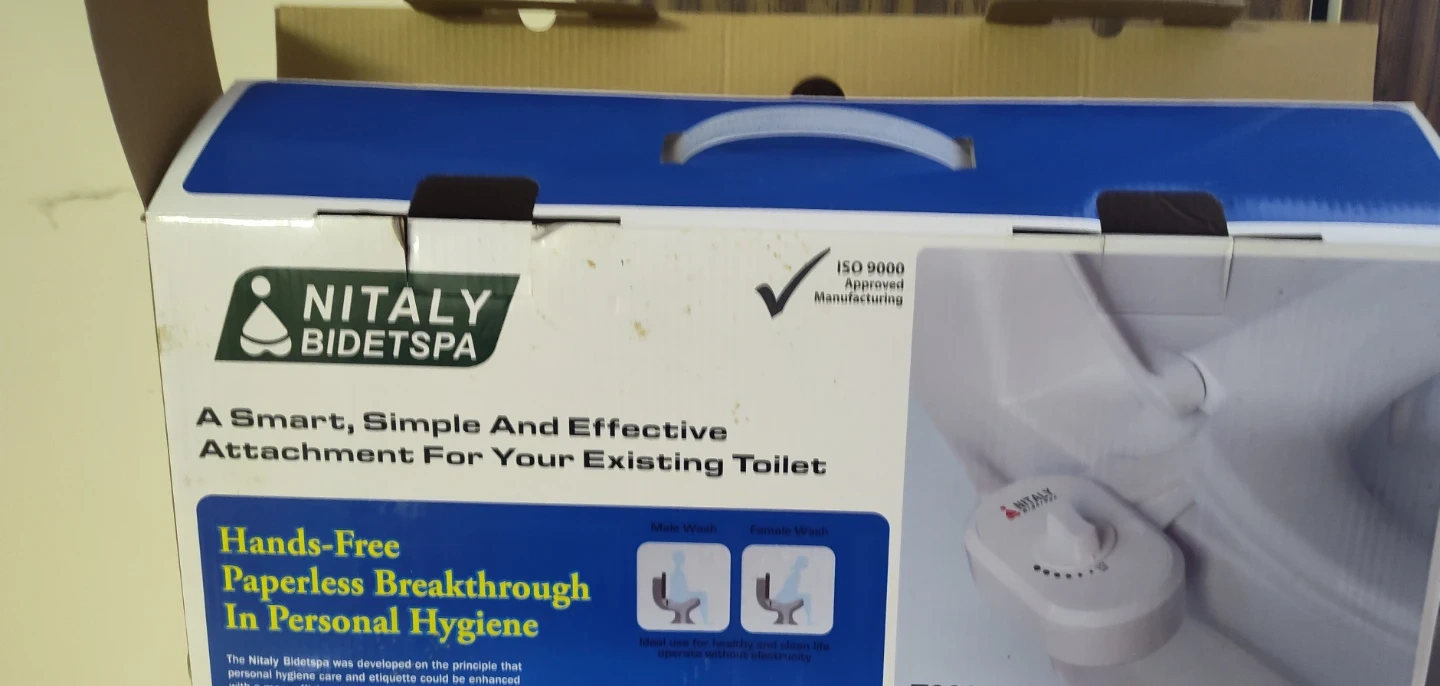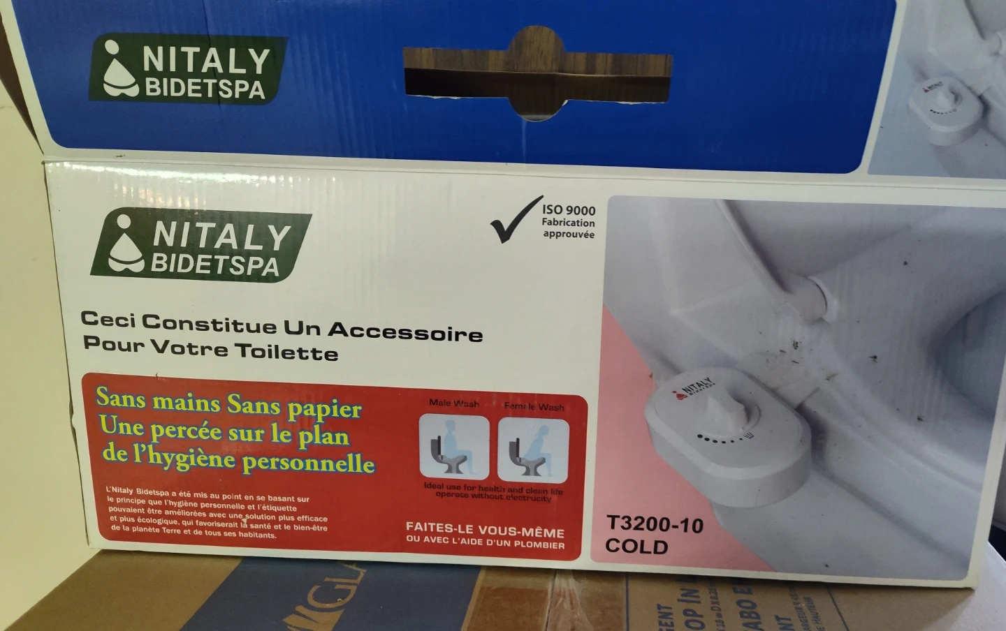 This is a Nitaly Bidetspa, model T3200-10. It's a smart, simple, and effective attachment for your existing toilet. It's a hands-free, paperless breakthrough in personal hygiene. The box indicates it's an ISO 9000 approved manufacturing product.
