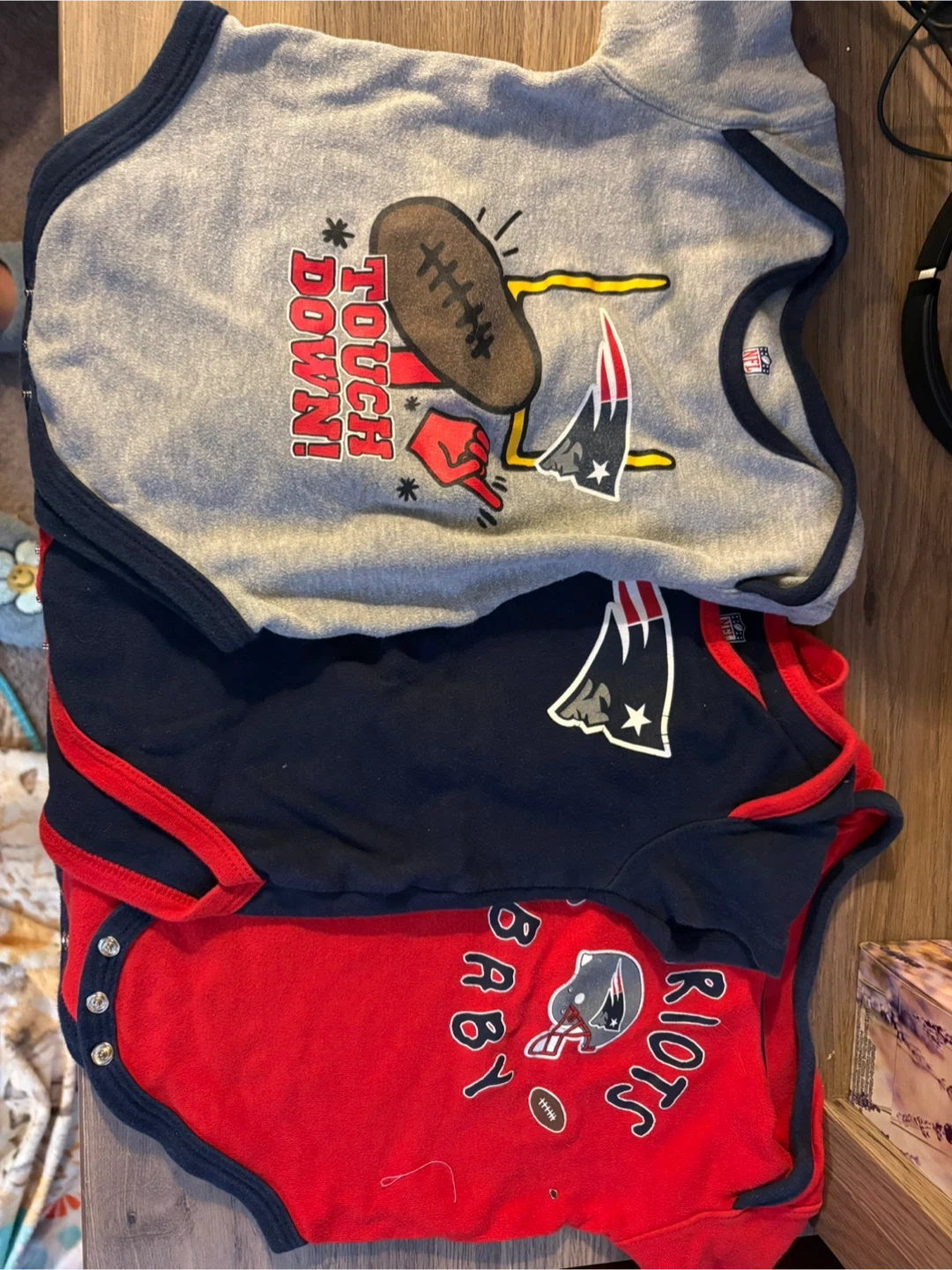 Selling three patriots onesies in size 18M. They feature fun football-themed designs and are perfect for your little sports fan