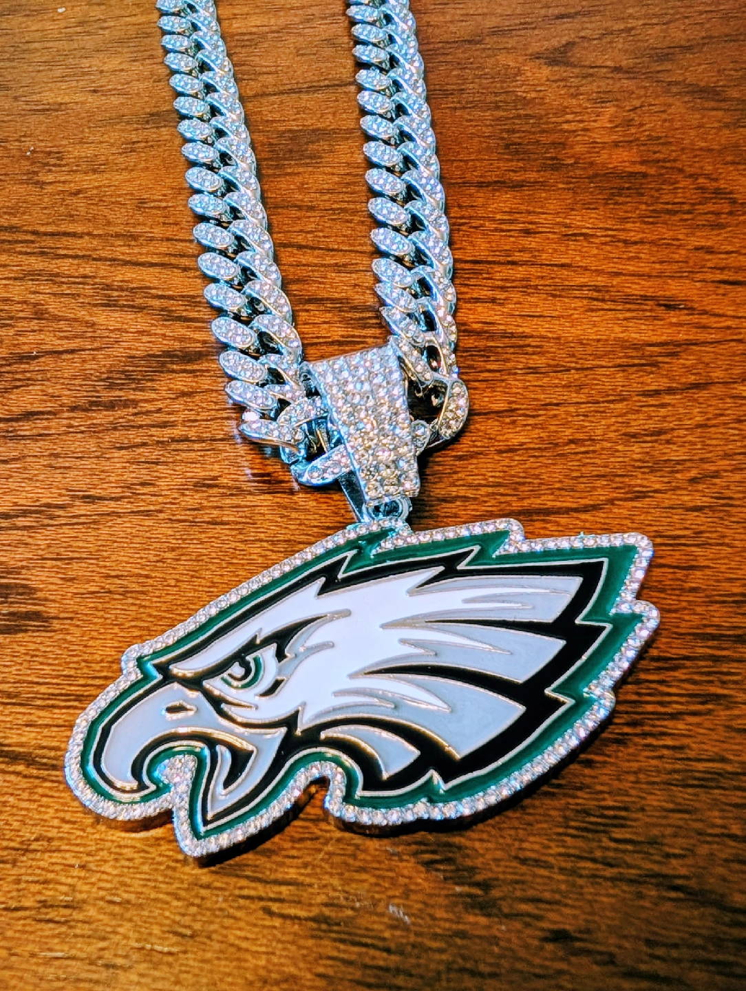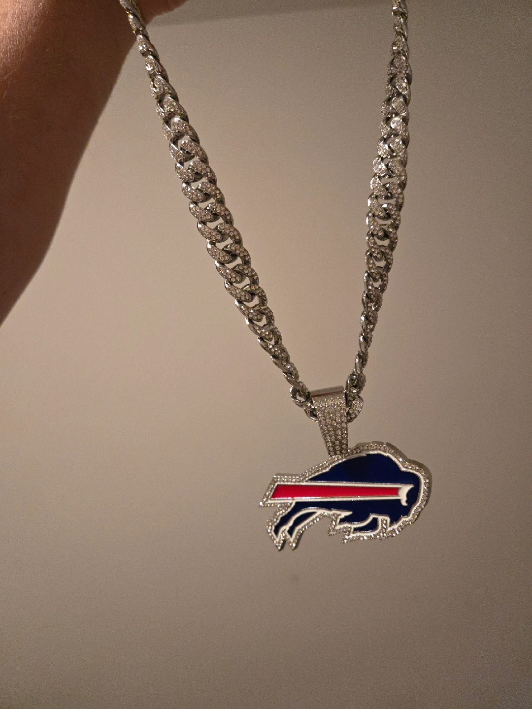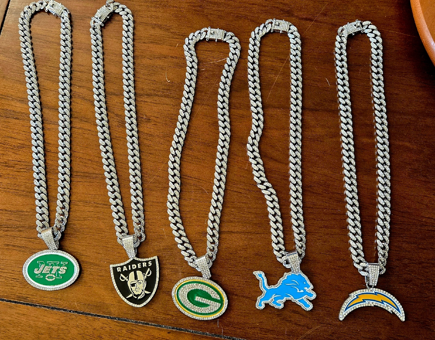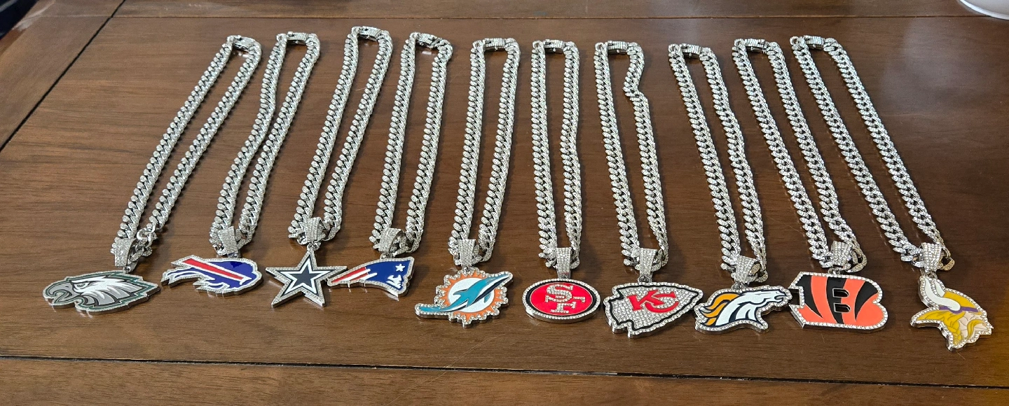 Selling a collection of NFL team logo chain necklaces! These feature a rhinestone design and are perfect for showing off your team spirit. Available teams include the Broncos, Bills, Eagles, Patriots, and many more! $40 each