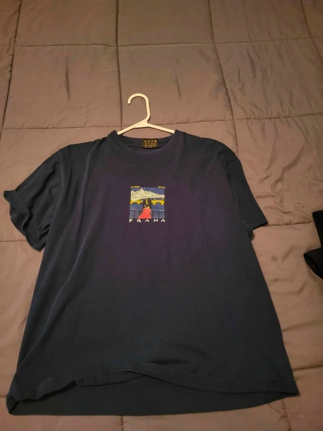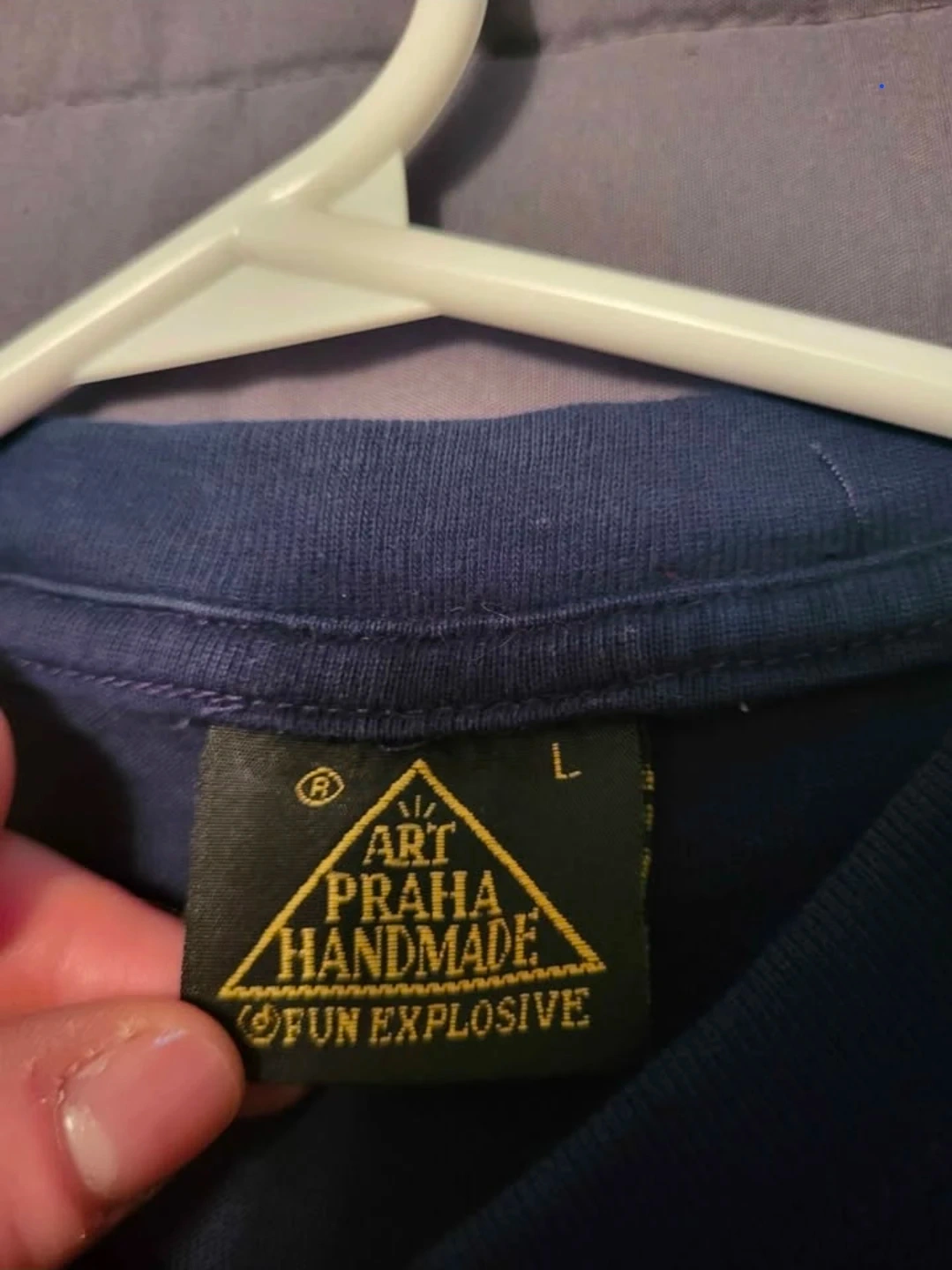 Navy blue t-shirt from Art Praha Handmade. It's a size large. Features a graphic print on the front with "PRABA" text below it. Cotton material.