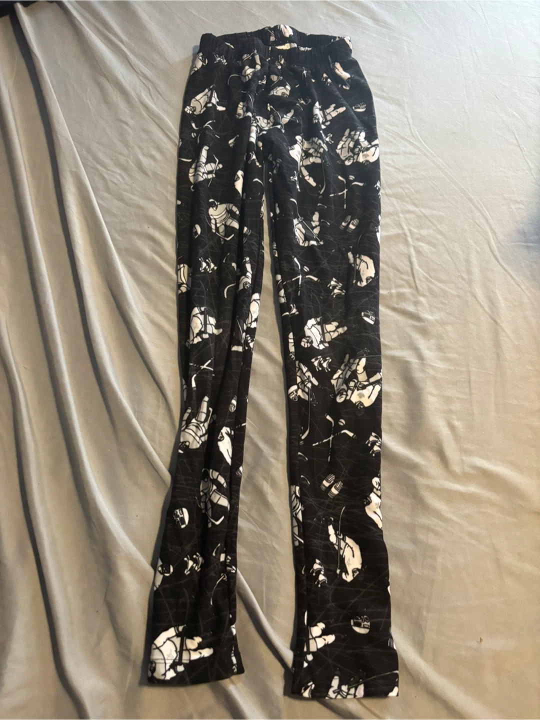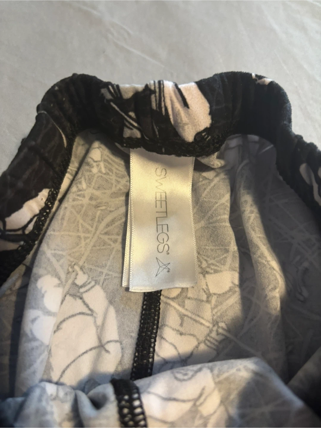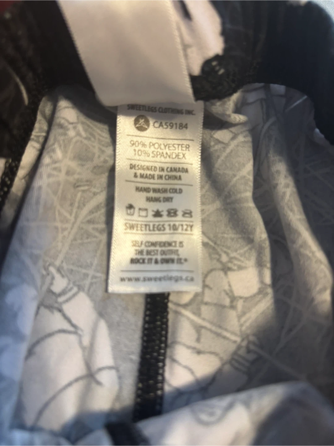 SweetLegs kids' leggings in size 10/12Y. These leggings are designed in Canada and made in China, featuring a 90% polyester and 10% spandex blend. They have a fun black and white patterned design throughout. Hand wash cold and hang dry for best care.