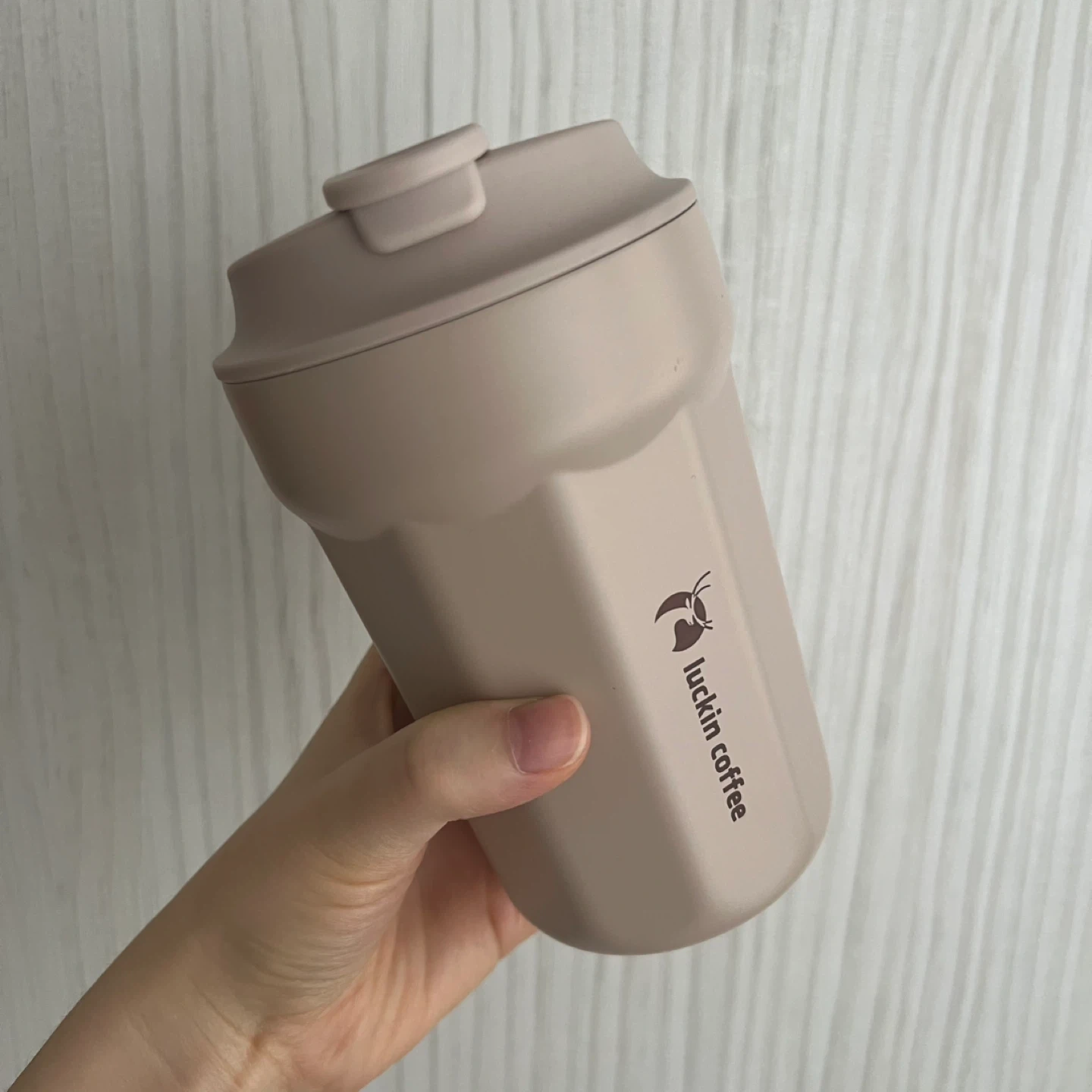 A tumbler from Luckin Coffee. It's made for hot or cold beverages. This cup is useful for taking your drinks on the go!