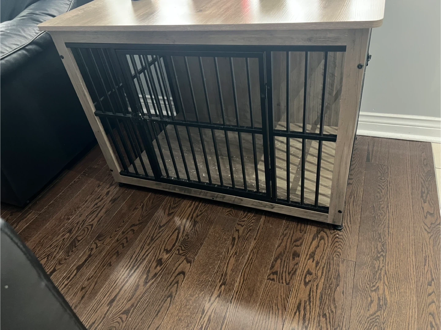 Selling a dog crate that doubles as an end table! It's in great condition and blends seamlessly with home decor. The crate features a sturdy wooden frame with black metal bars, providing a safe and stylish space for your furry friend