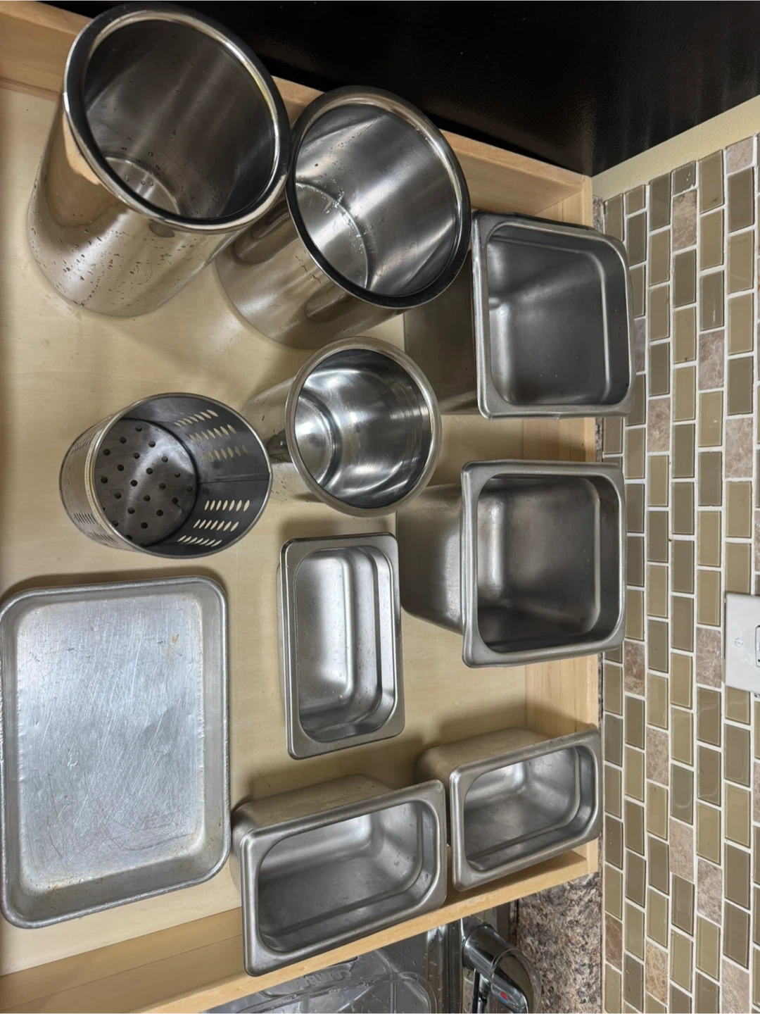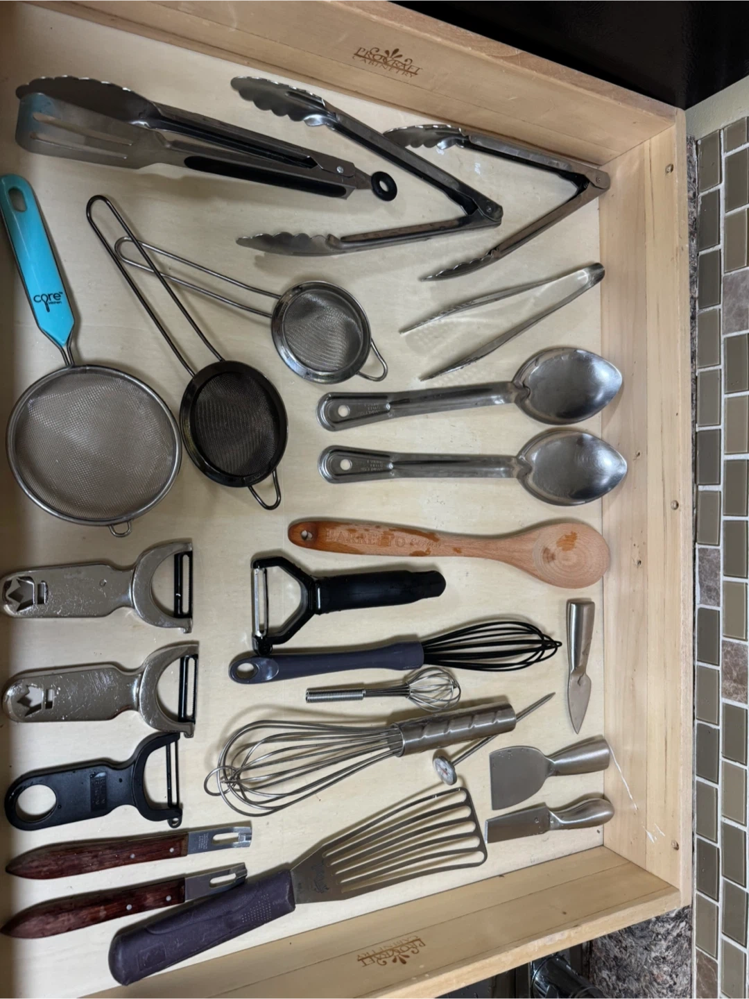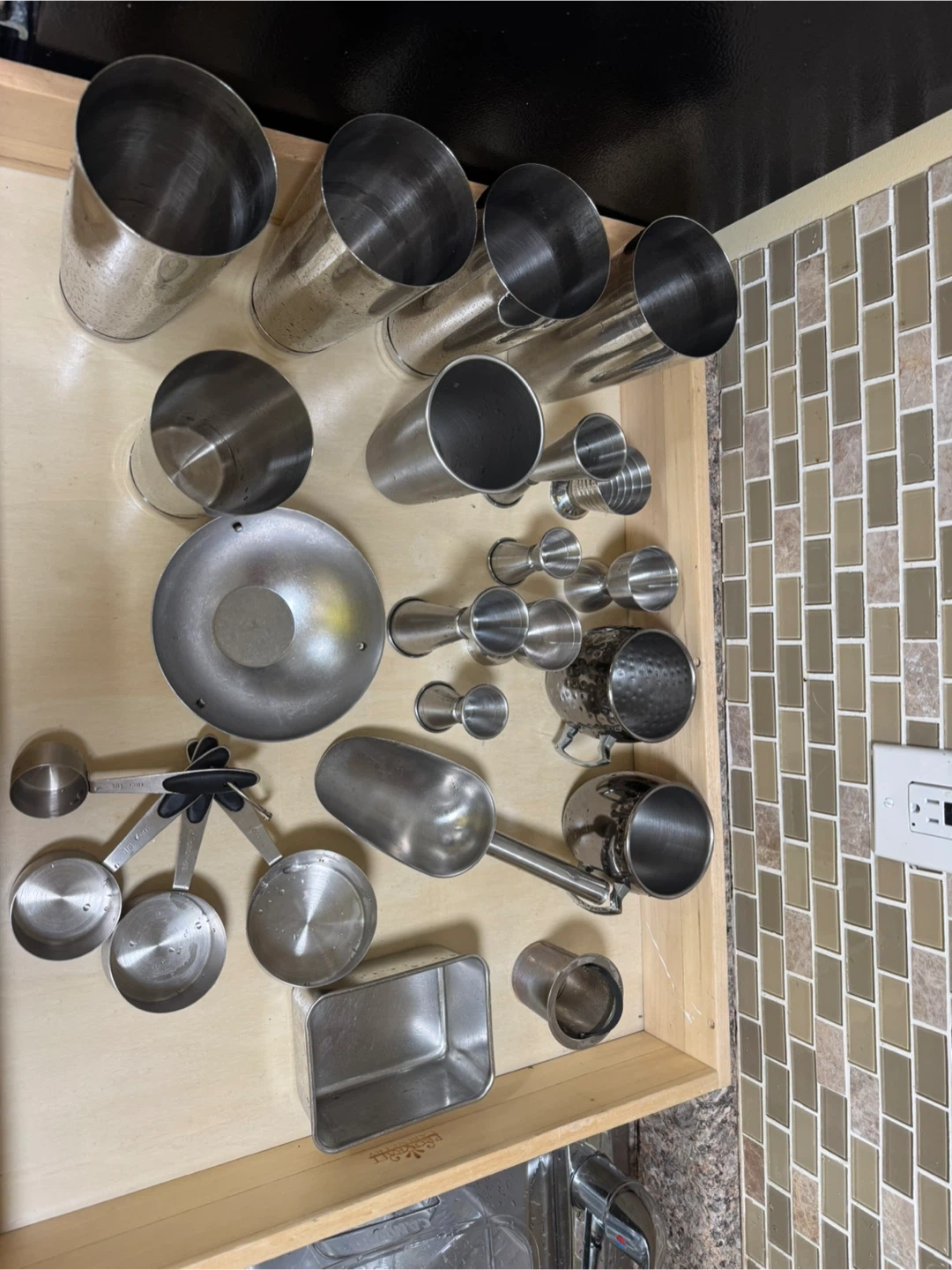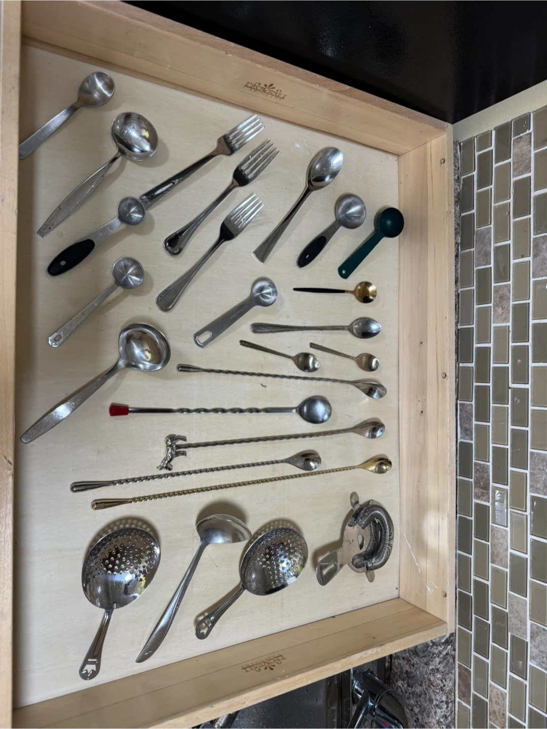 This collection includes various bar tools like jiggers, strainers, and openers, alongside kitchen essentials such as peelers, whisks, and measuring spoons. Stainless steel and wood construction. Great for home bar or kitchen.