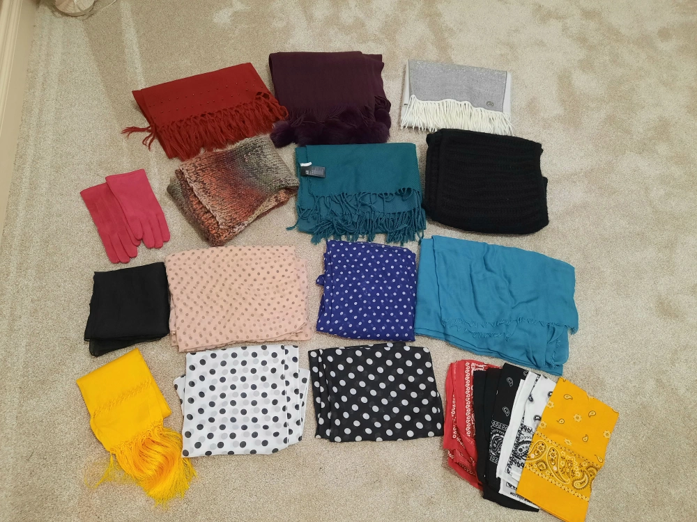 17 women's scarves and 1 pair of gloves, all in excellent condition. Comes from smoke and pet free home. Pick up Bayside, Airdrie or Panorama Hills, Calgary. Please take a look at my other ads.