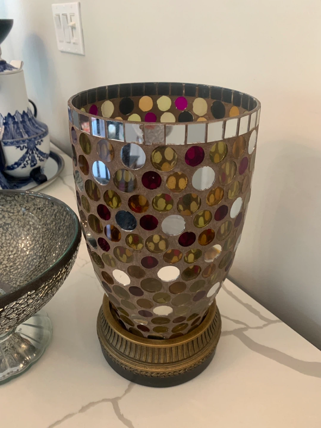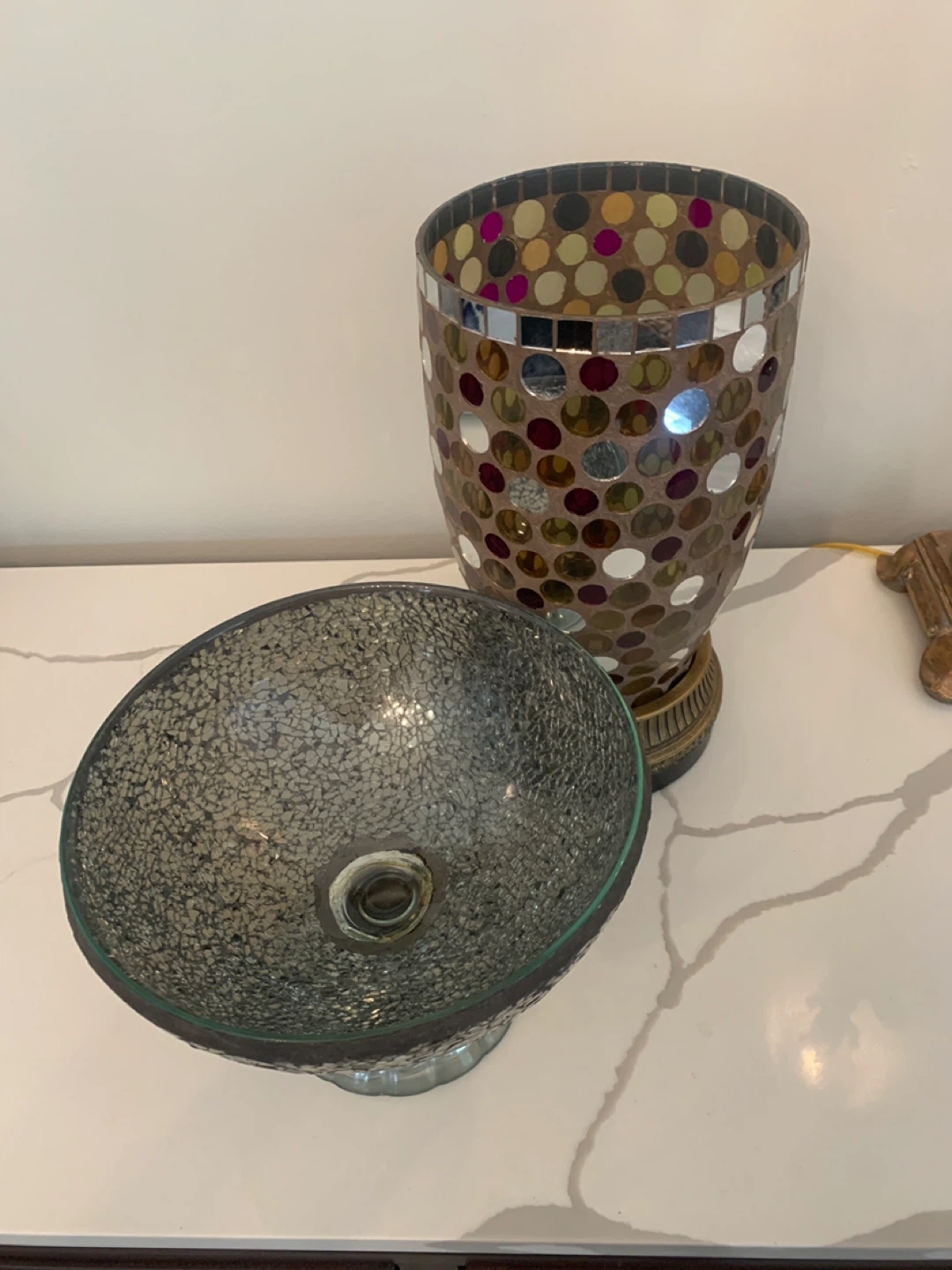 Mosaic glass pedestal bowl and matching vase. The bowl has a textured grey mosaic finish, while the vase features a colourful mosaic pattern with metallic accents. Both pieces have a metallic base.Vase is a Partylite candle holder both for 20