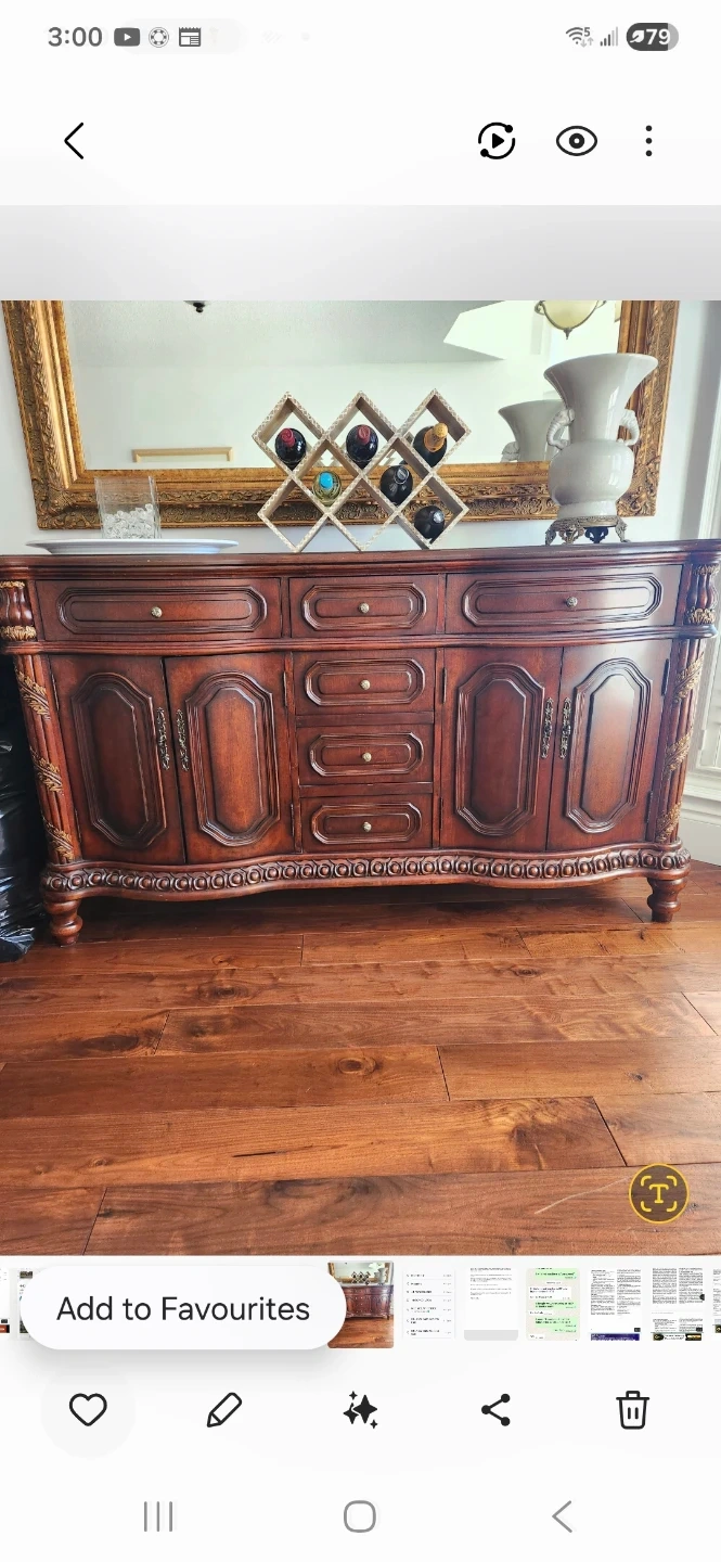Beautiful dark wood buffet server with detailed carvings. It features multiple drawers and two cabinet doors for ample storage. Perfect for dining rooms or as a console table.