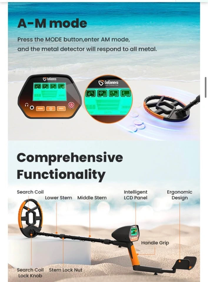 Brand new GoGonova metal detector. Features All Metal Mode and Disc Mode to discriminate for a specific metal. Adjustable stem from 39.3 to 51.3 inches, suitable for kids ages 8-12 and adults. Intuitive Large LCD Display and IP68 Waterproof Search Coil. Comes in its original box.