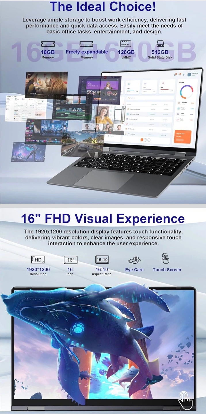 2-in-1 16 inch 1920x1200 FHD Touchscreen Laptop
