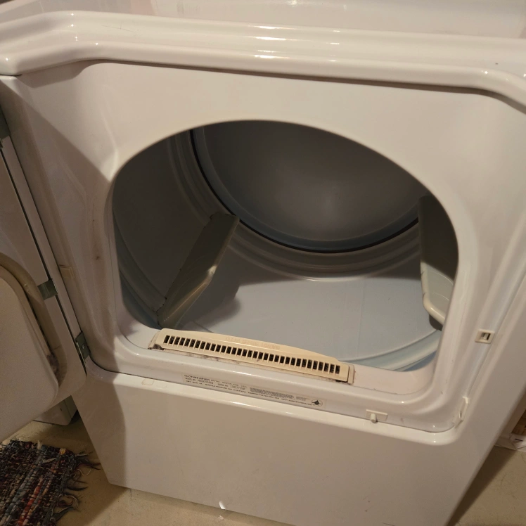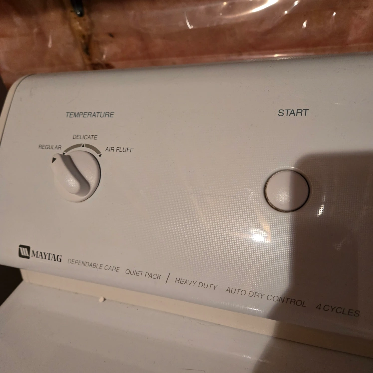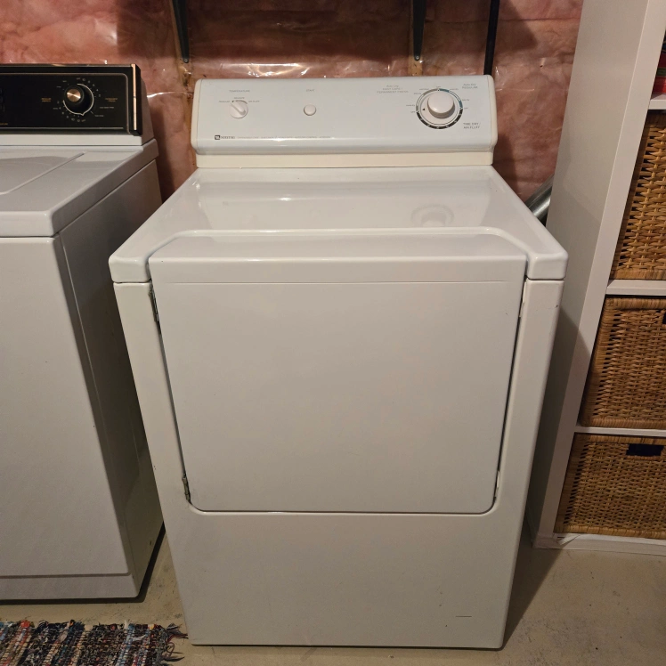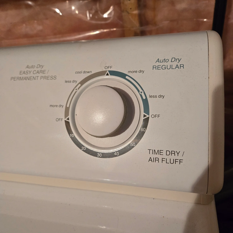 White GAS dryer in good condition. Includes various settings including auto dry, time dry, air fluff, and heavy duty.