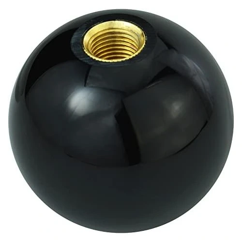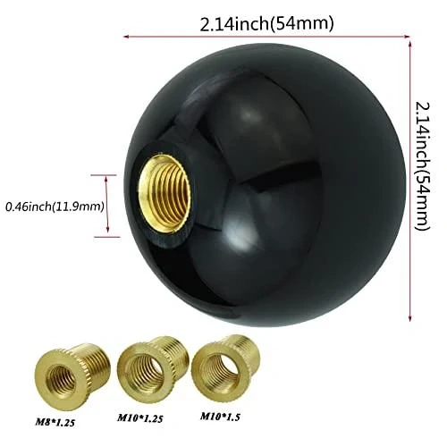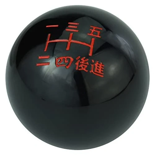This is a black, spherical shift knob featuring a 5-speed manual transmission pattern in red. It's made of a durable, glossy material. Includes multiple thread adapters for easy installation on various vehicles. Diameter is 54mm.