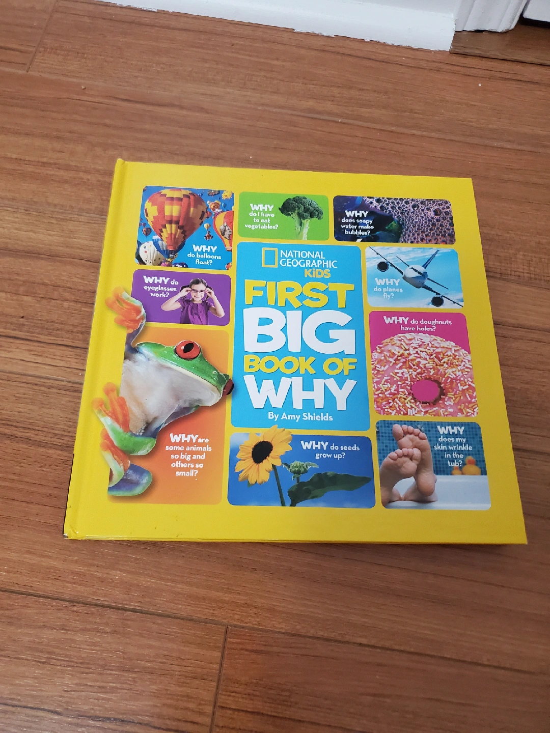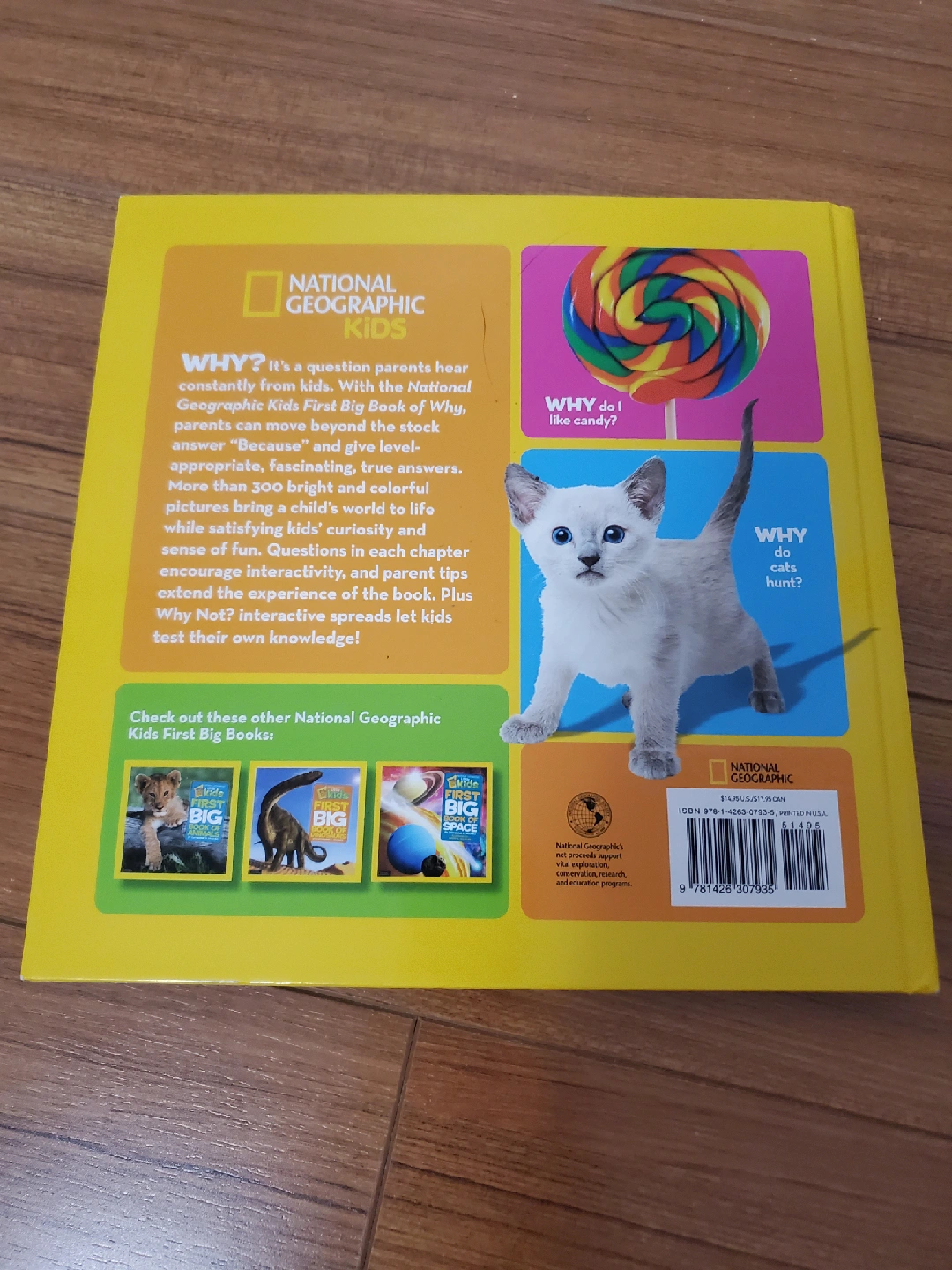 Selling a National Geographic Kids First Big Book of Why. It's a question parents hear constantly from kids. With the National Geographic Kids First Big Book of Why, parents can move beyond the stock answer "because" and give level-appropriate, fascinating, true answers. More than 300 bright and colorful pictures bring a child's world to life while satisfying kids' curiosity with a sense of fun. Questions in each chapter encourage interactivity, and parent tips extend the experience of the book. Plus Why Not? Interactive spreads let kids test their own knowledge! smoke free