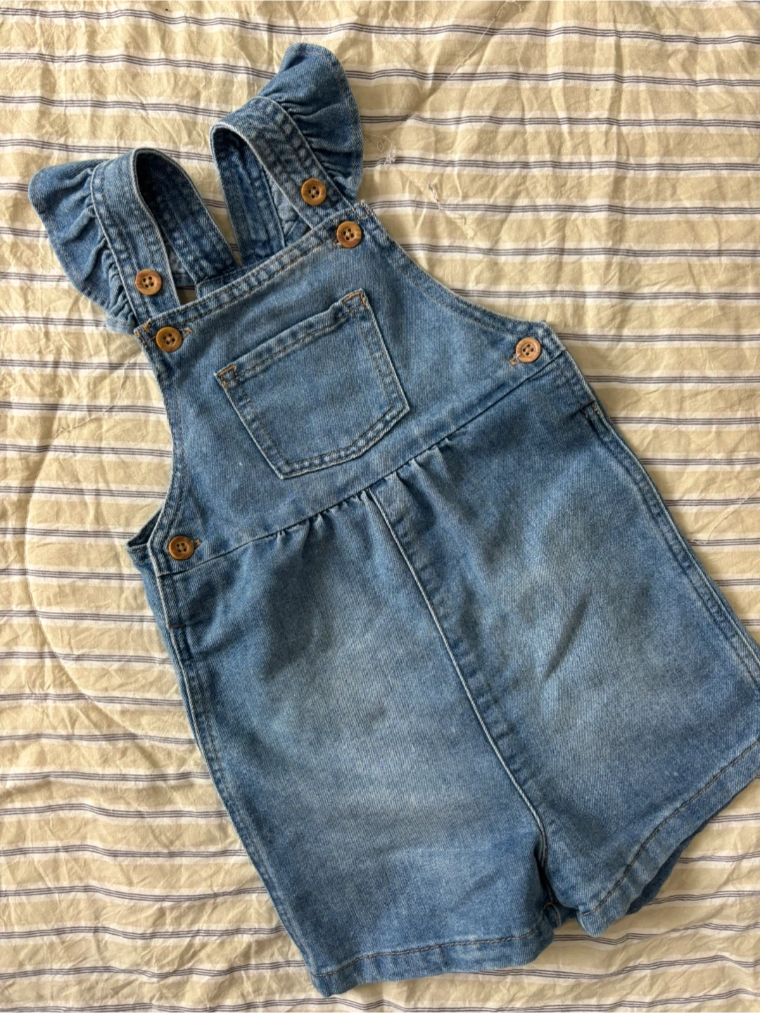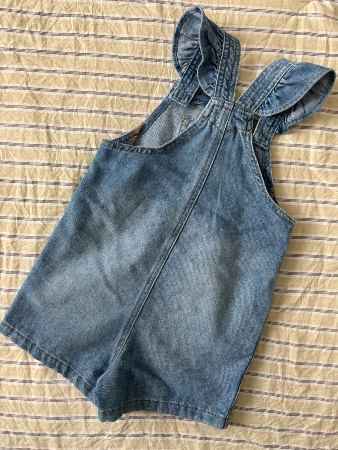 Cute H&M denim short overalls with ruffled shoulder straps and wooden button accents. Made from soft denim material.