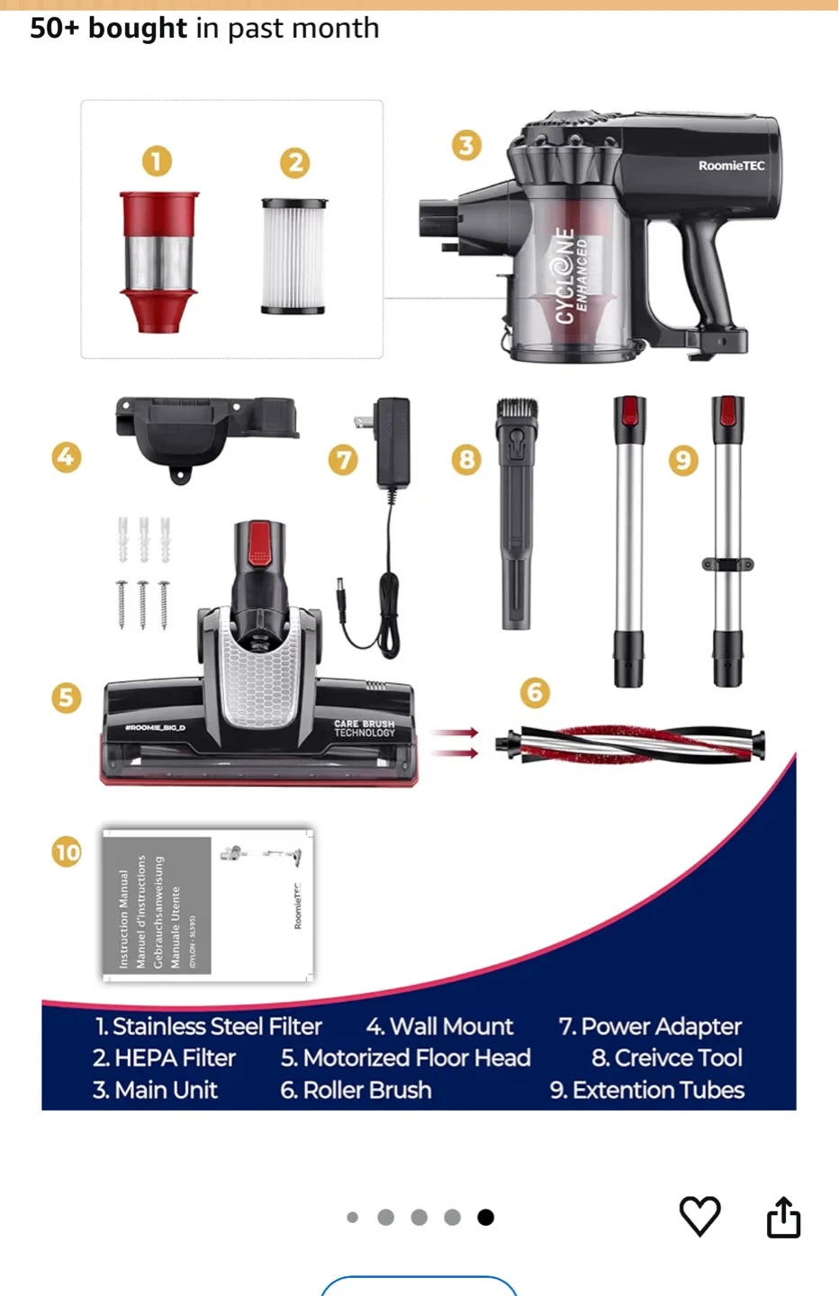 This RoomieTec vacuum features a cordless design for easy manoeuvring. It includes a main unit, motorized floor head, HEPA filter, and extension tubes. A wall mount is also provided for convenient storage.