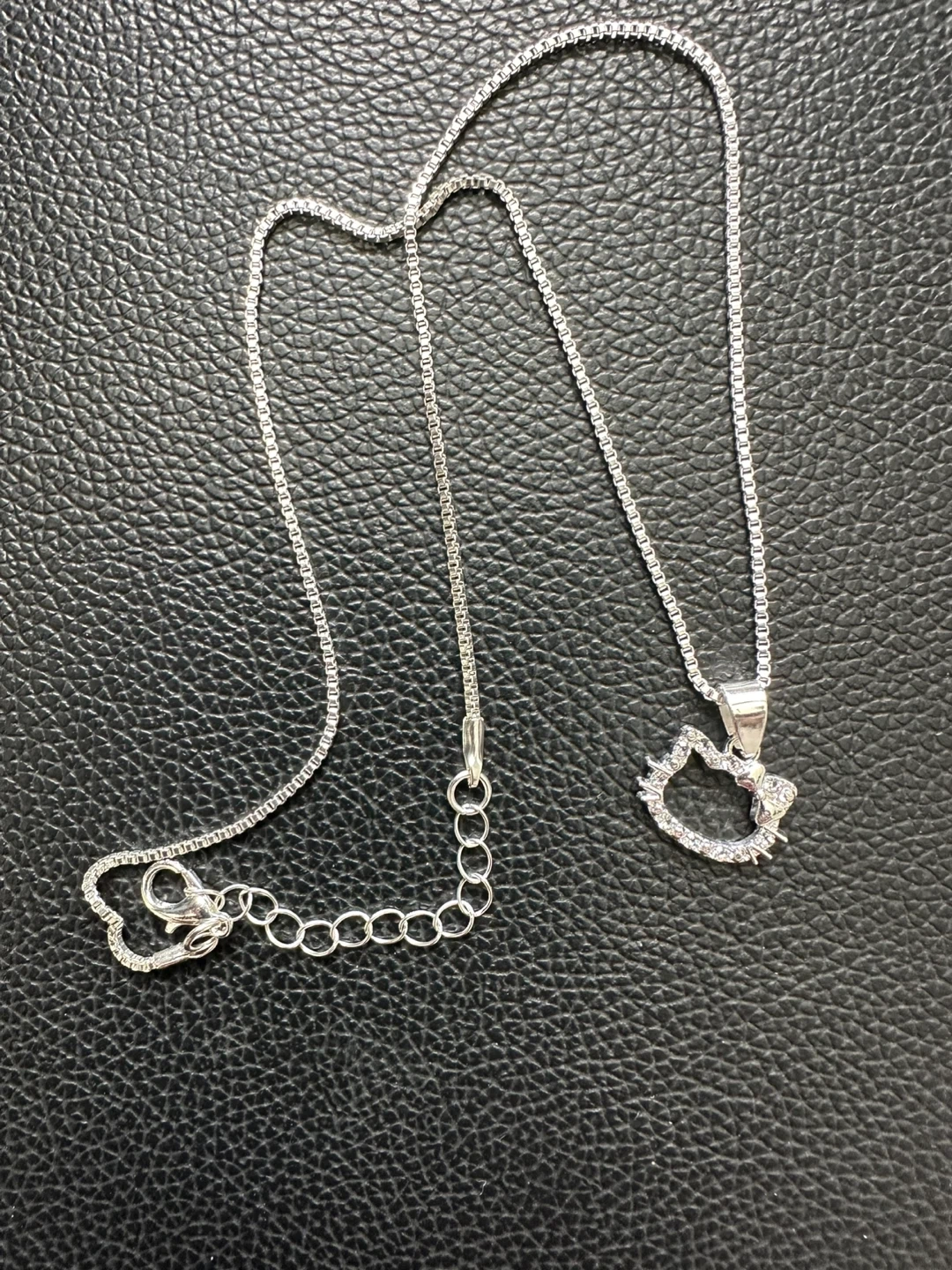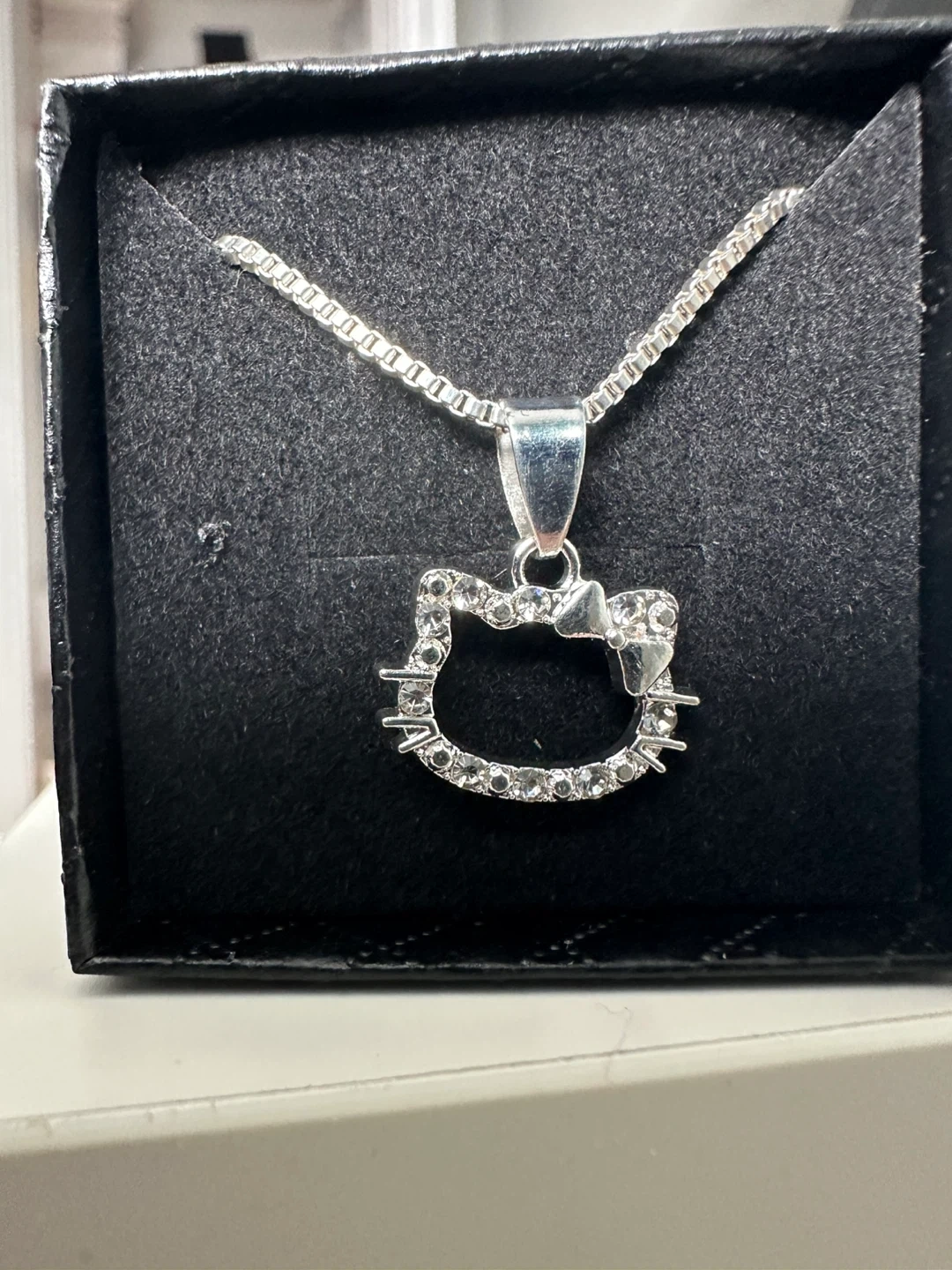 This is a silver-toned necklace featuring a sparkly Hello Kitty pendant. It has a chain with an adjustable clasp. This necklace is a fun accessory for any occasion. Brand new in black gift box