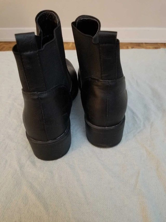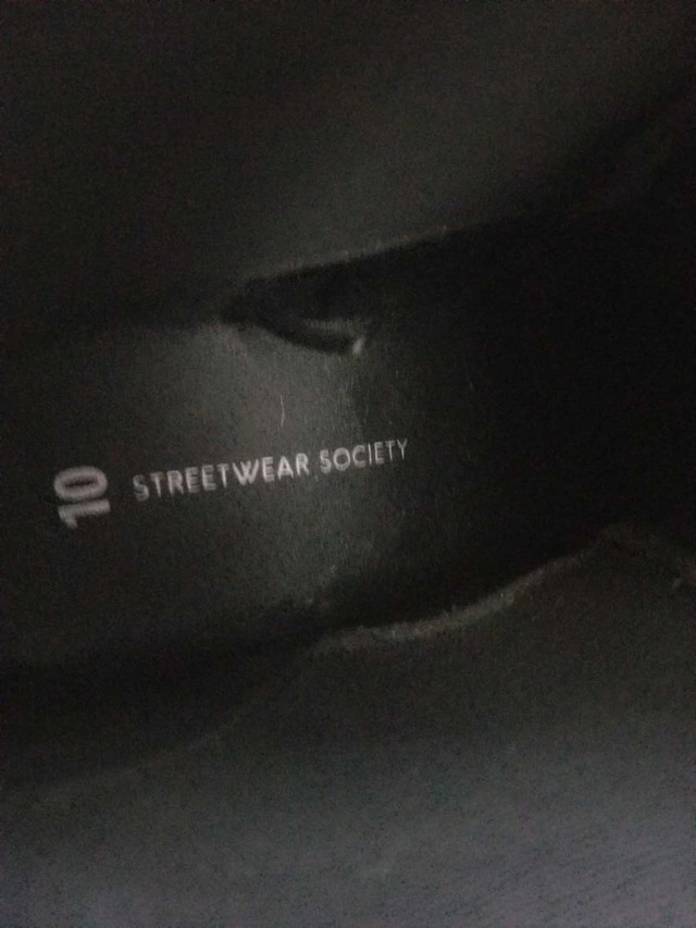 Step out in style with these Streetwear Society black ankle boots, perfect for adding a sleek touch to any outfit. They are marked as a size 10 and are in good condition, showing only slight signs of wear. These boots are ready for a new adventure. If the ad is up, these fashionable boots are still available.