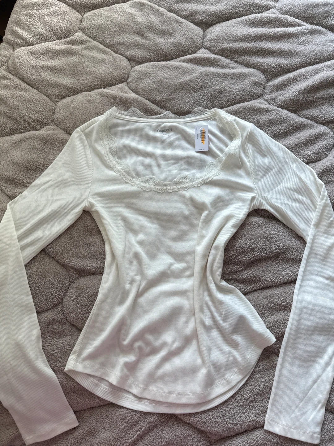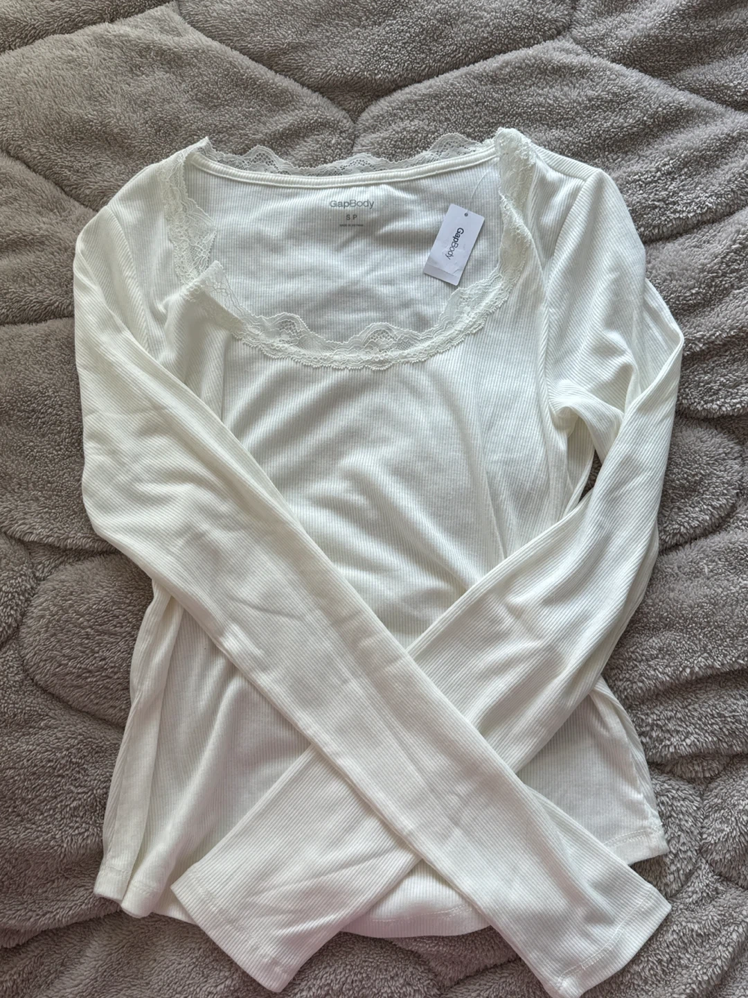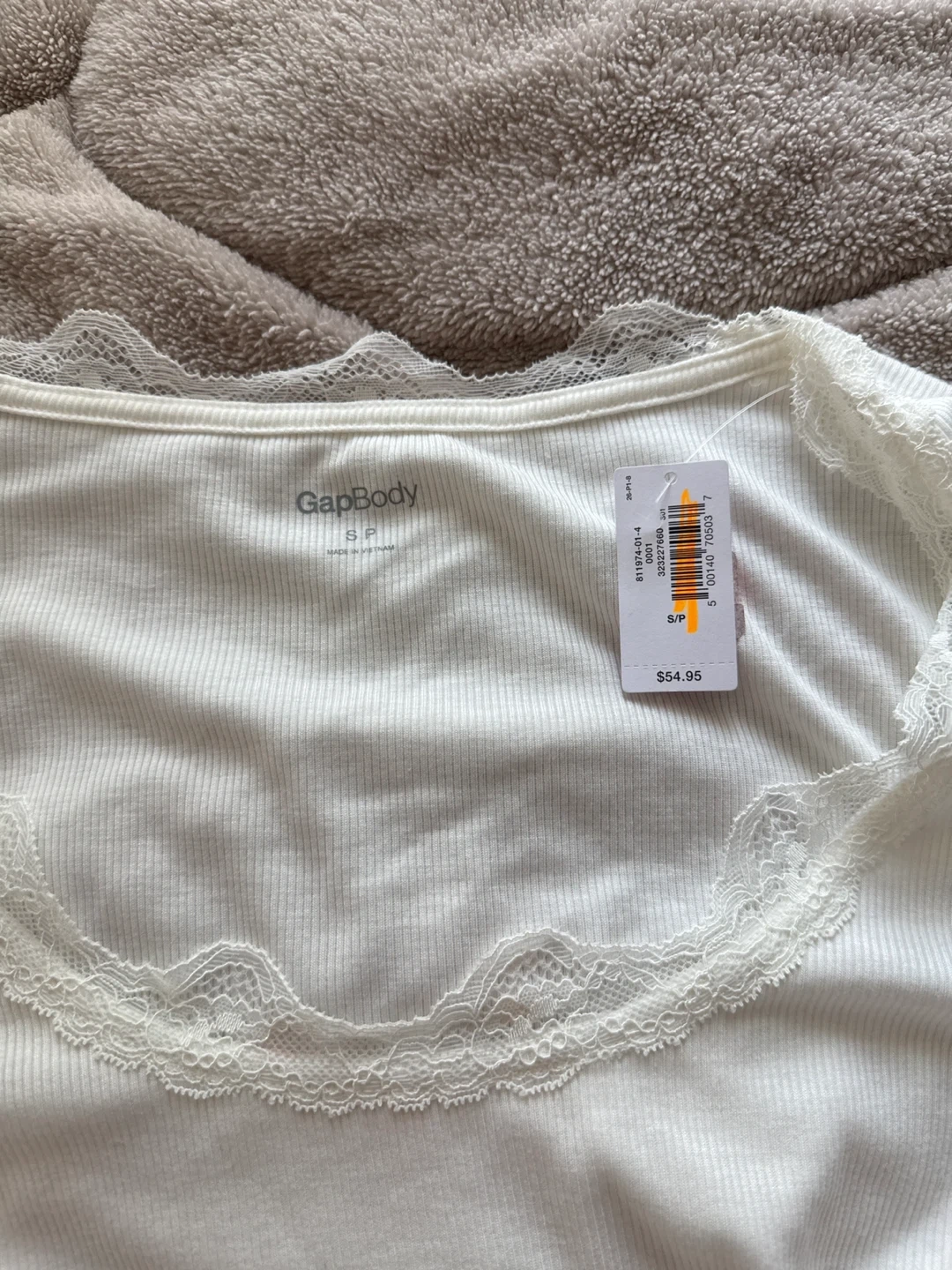 brand new with tags, ribbed GAP body with lace trim on the neckline! the size is suitable for s m sizes, it was a gift but unfortunately it doesnt fit me, has really nice soft material!