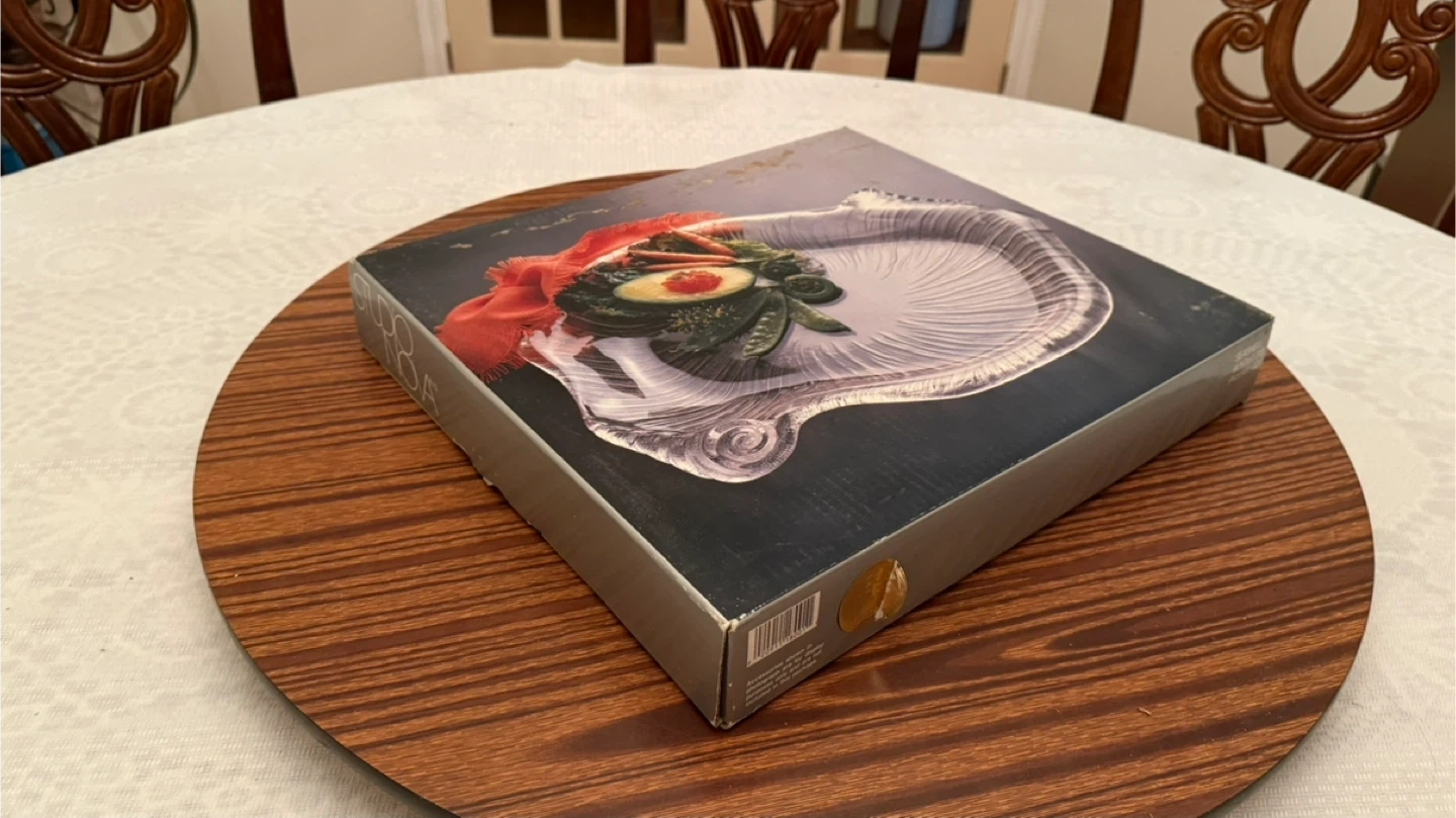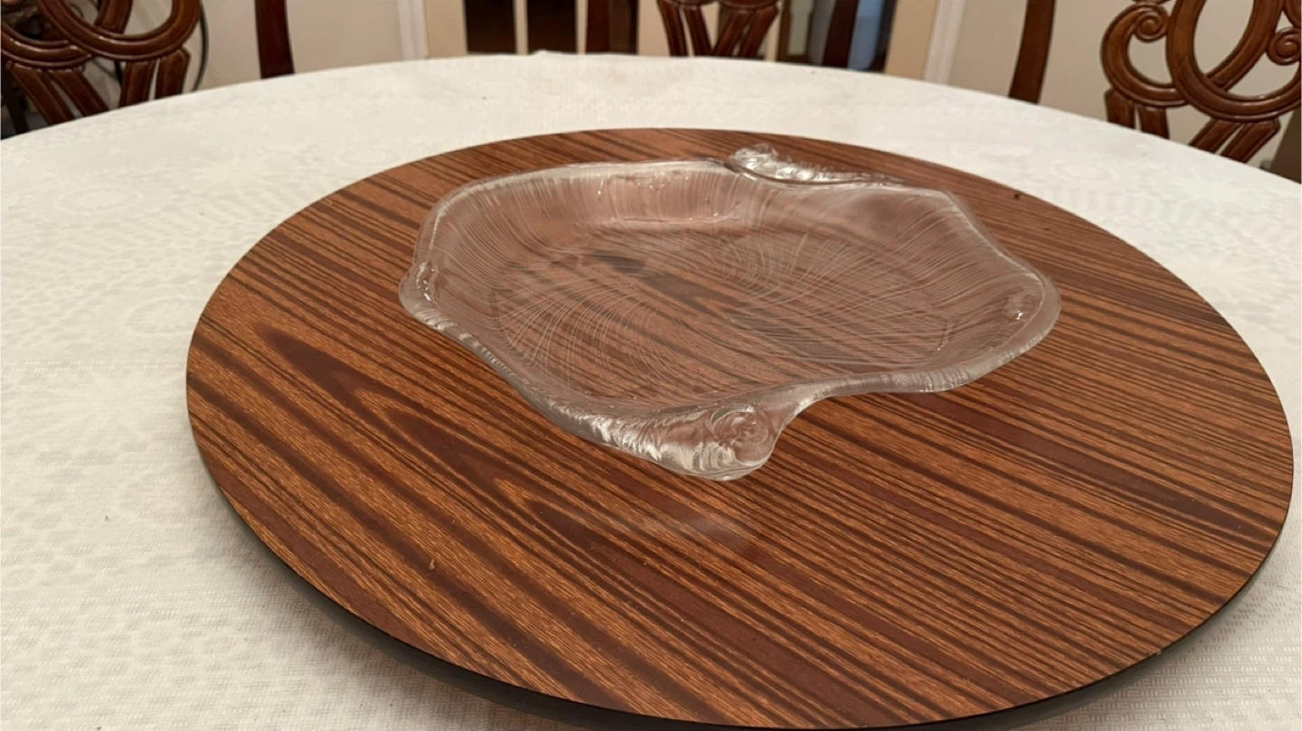 This is a clear glass serving platter with a unique, swirling design. It has decorative edges that add a touch of elegance. Its size makes it suitable for serving appetizers or desserts at gatherings.