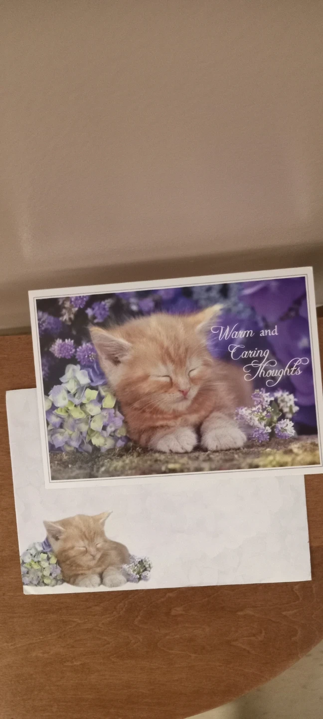 A sweet card featuring a sleeping kitten surrounded by flowers. The front reads 'Warm and Caring Thoughts'. Inside it says '...and all of them for you. Get Well Soon'. Perfect for sending well wishes.
