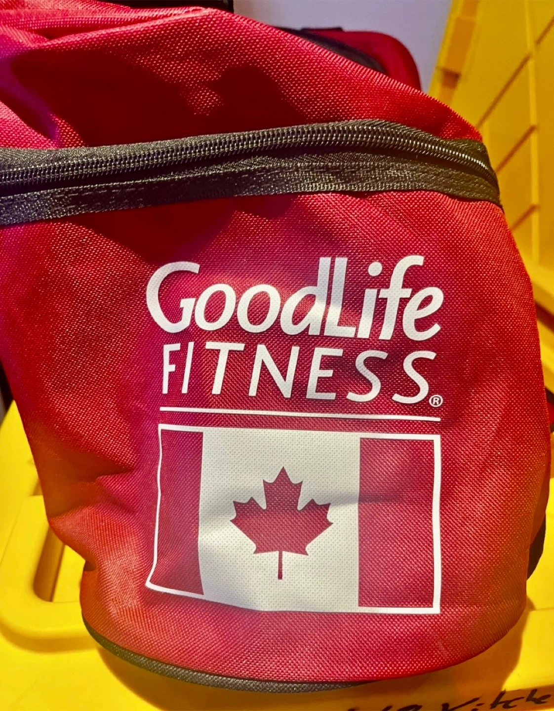Red and black duffle bag with "GoodLife FITNESS" logo and a Canadian maple leaf. It's still in its original packaging. Bag has handles and zippered compartments.
