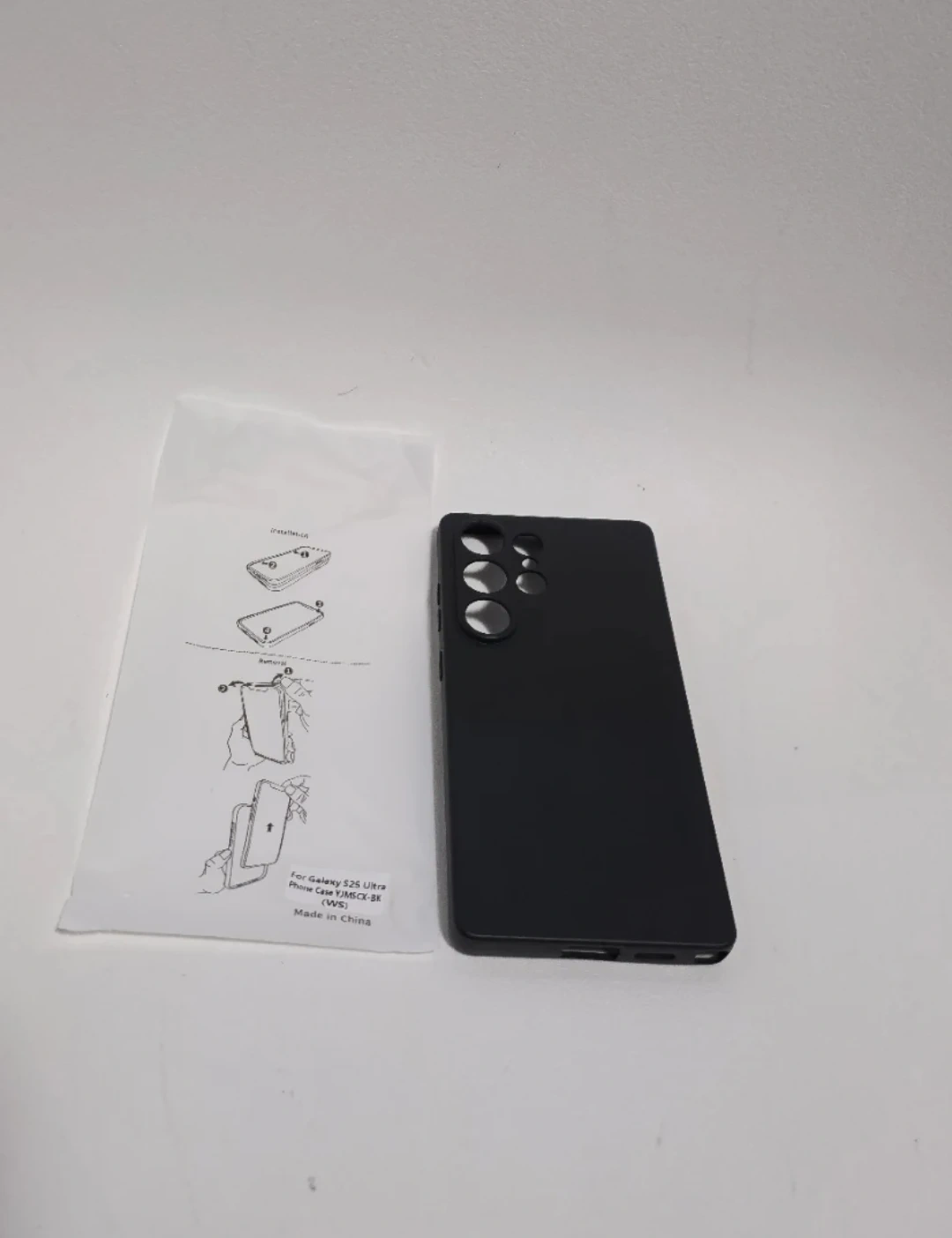 This is a black phone case designed for the Samsung Galaxy S25 Ultra. It's made from a durable material to protect your phone. The case comes with instructions for application.