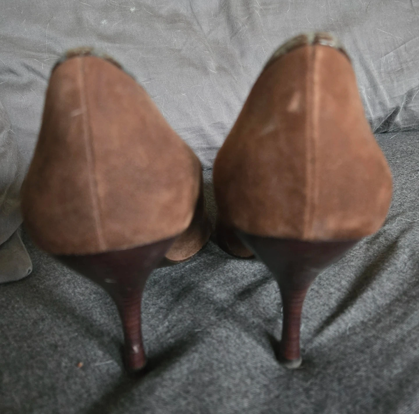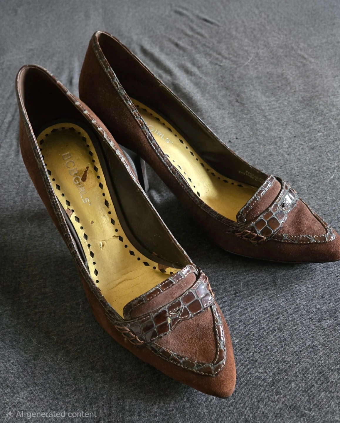 BCBGirls brown suede pumps with faux crocodile trim. Features a pointed toe and stiletto heel. These shoes are stylish and suitable for various occasions.