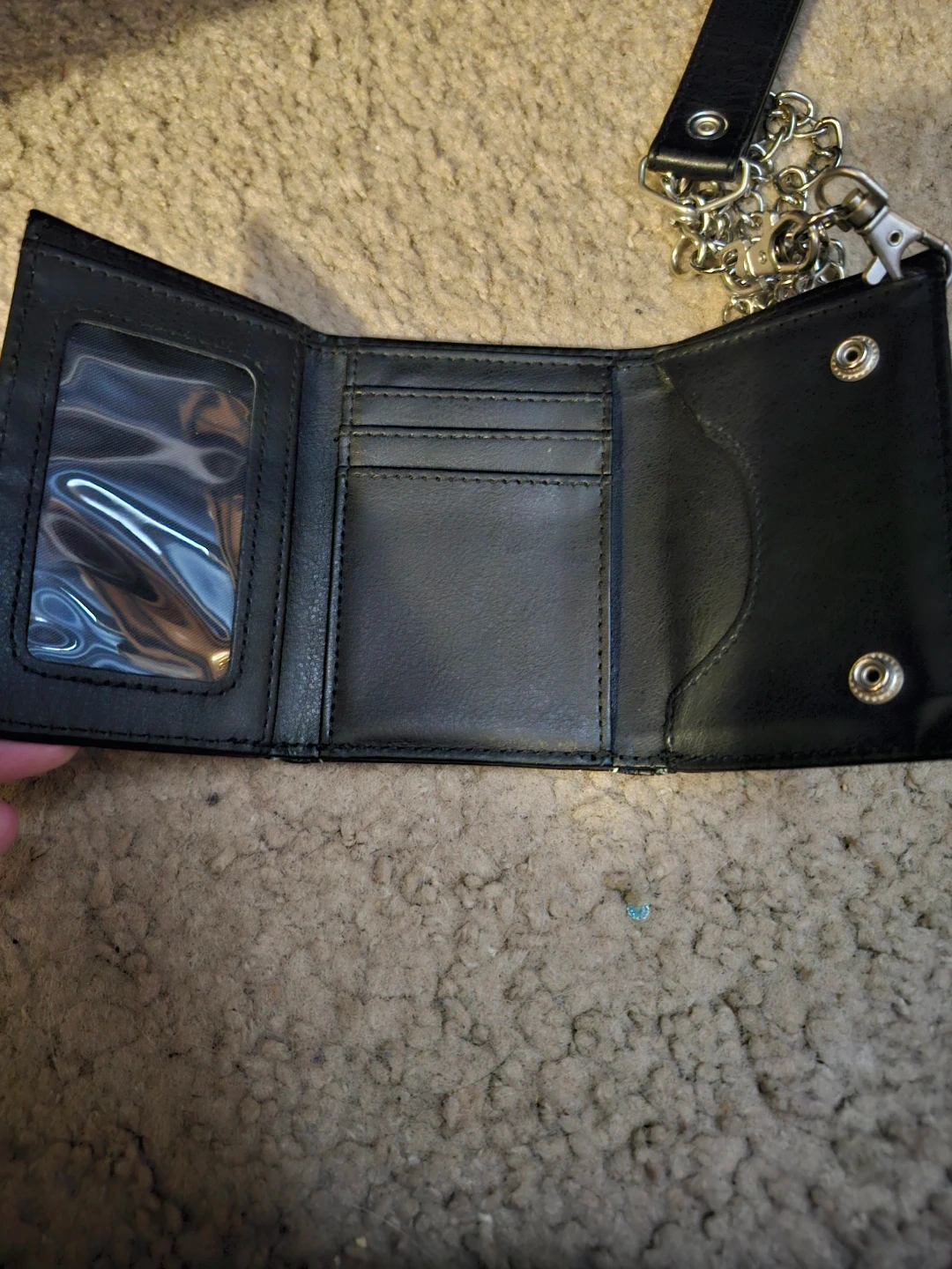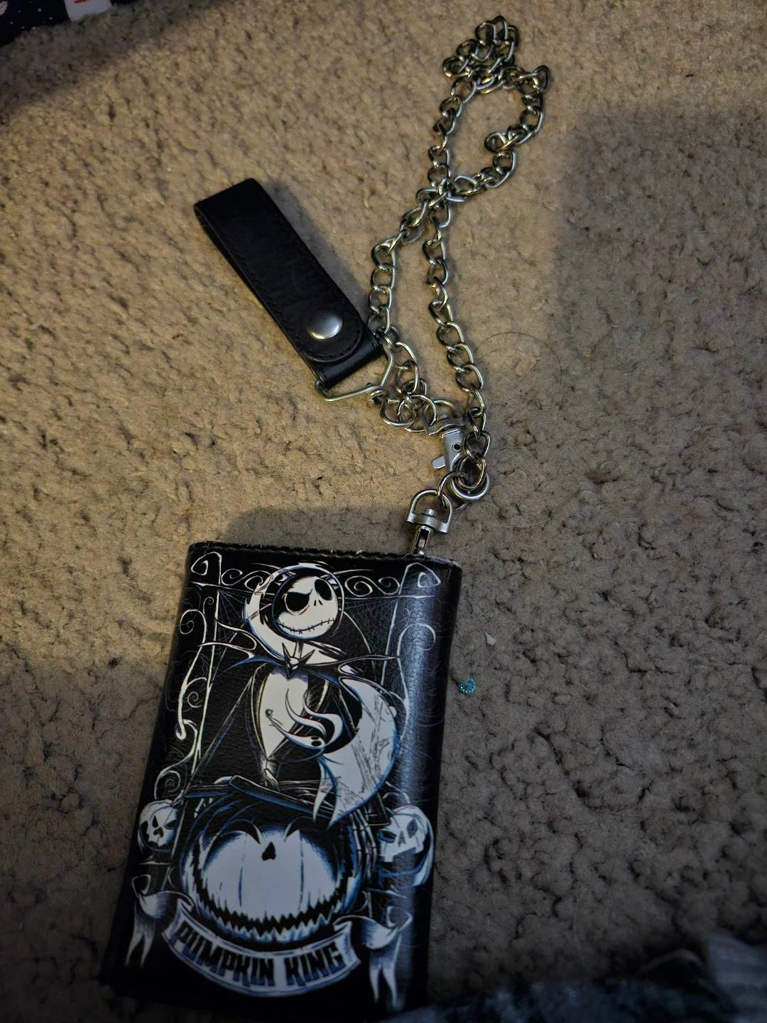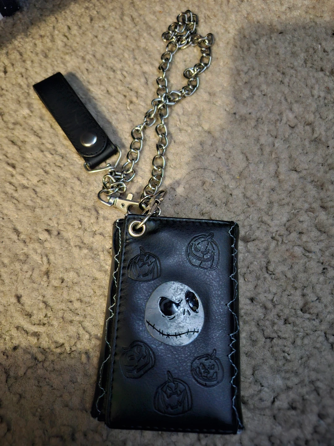 Bifold wallet featuring Jack Skellington and pumpkin designs. It's black with a chain and has card slots inside. Perfect for fans of the movie!